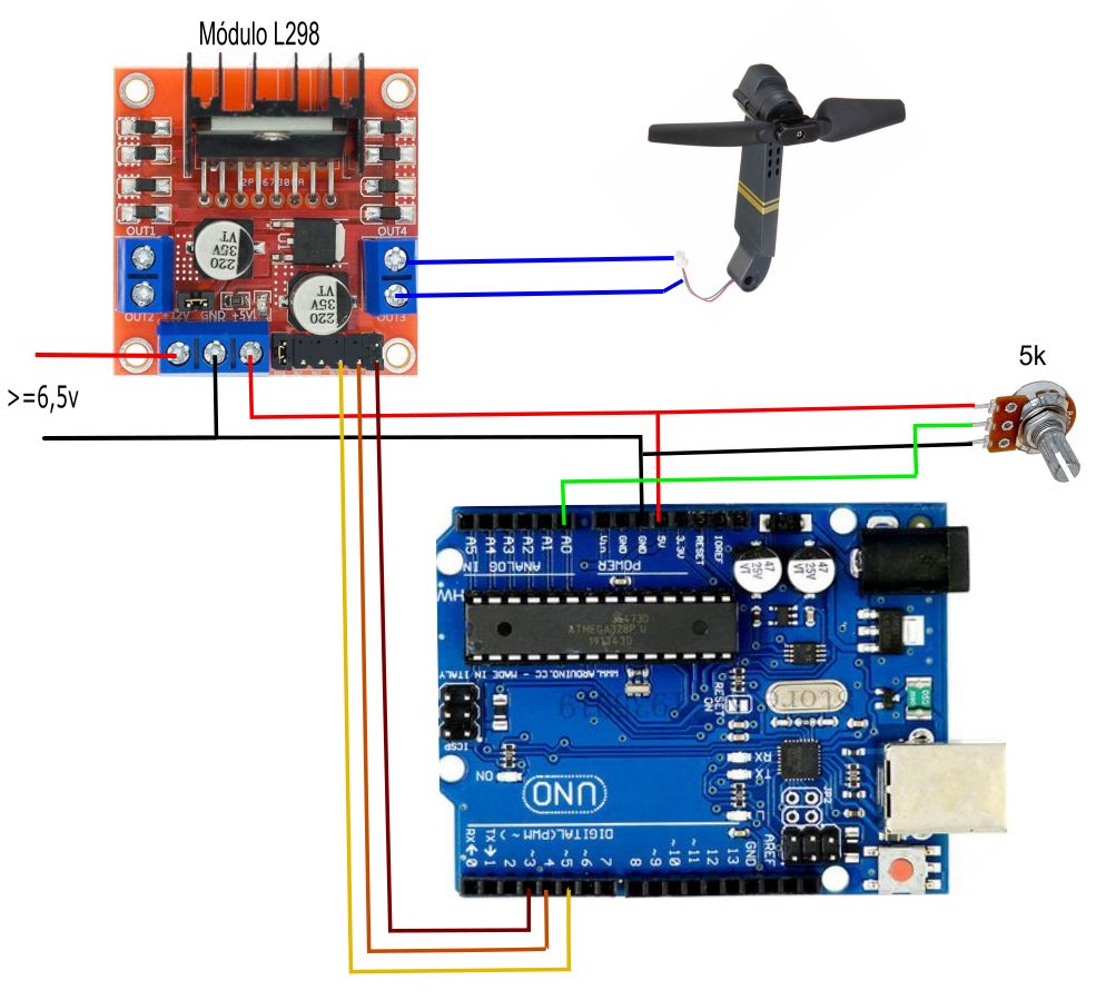 Usaremos: -Un Arduino (cualquiera) -Un módulo L298 para alimentar el motor de la hélice. -Un potenciómetro de 5kΩ -Un motor con hélice.
