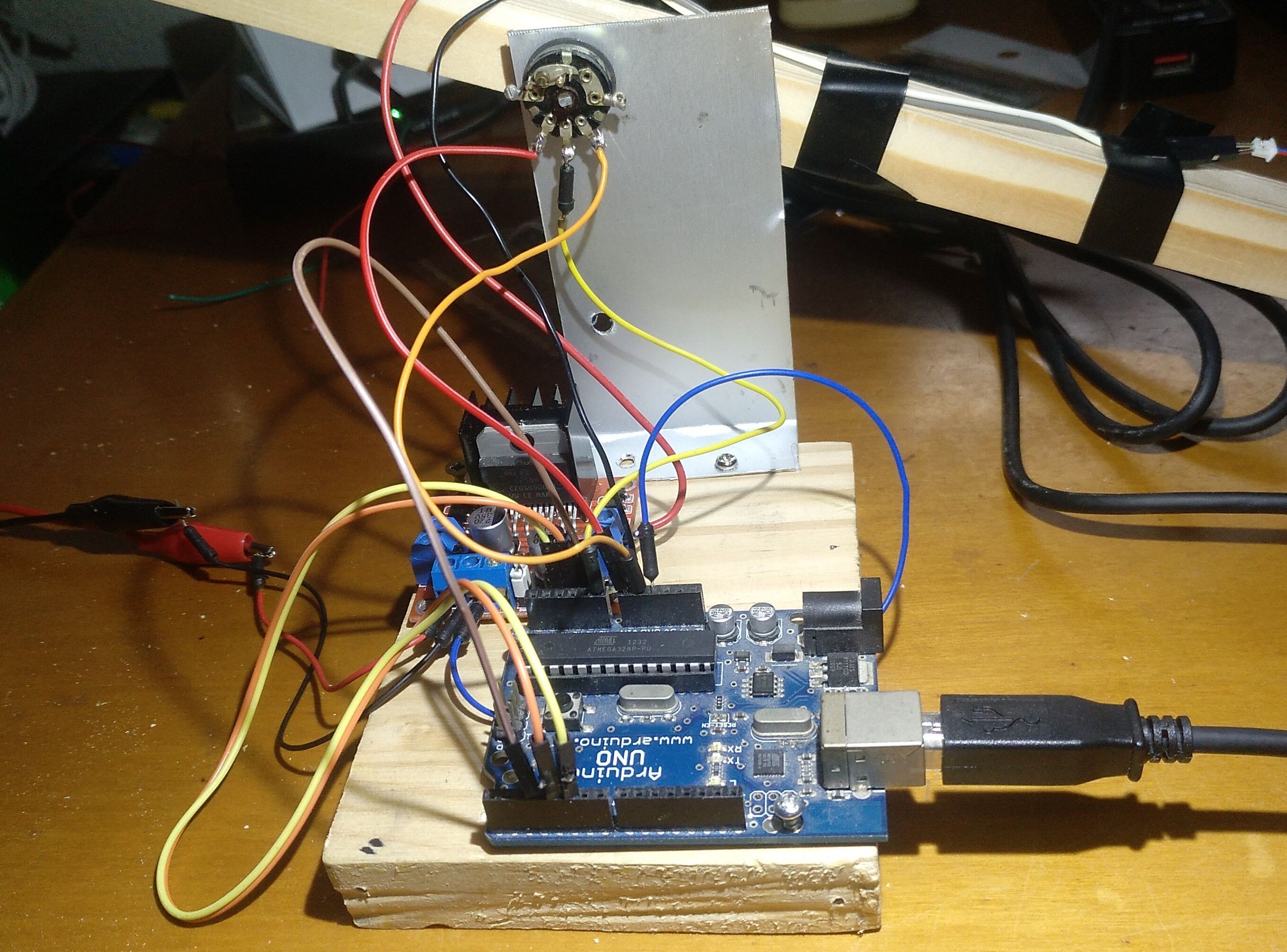 En un listón de 2x2cm y unos 40cm de largo fijamos el espárrago del potenciómetro en un taladro de 6mm. Lo siguiente es cargar el Sketch AnalogInput de los ejemplos de Arduino. Pondremos el listón horizontal y anotamos que valor da en el monitor serial. Es el valor que nos importa (nos da igual la resistencia real), ese será el Setpoint. En mi caso era 154, pero podría ser otro.