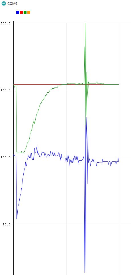 A la derecha la gráfica de tres parámetros. En rojo el Setpoint (154) que queremos alcanzar. En verde el balancín va subiendo y la resistencia del potenciómetro se iguala al Setpoint. En azul las variaciones de PWM para alcanzar el objetivo. También vemos las alteraciones provocadas por un golpe en el balancín y lo poco que tarda en estabilizarse.