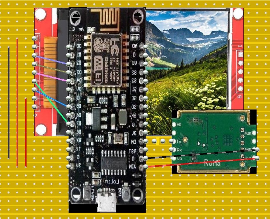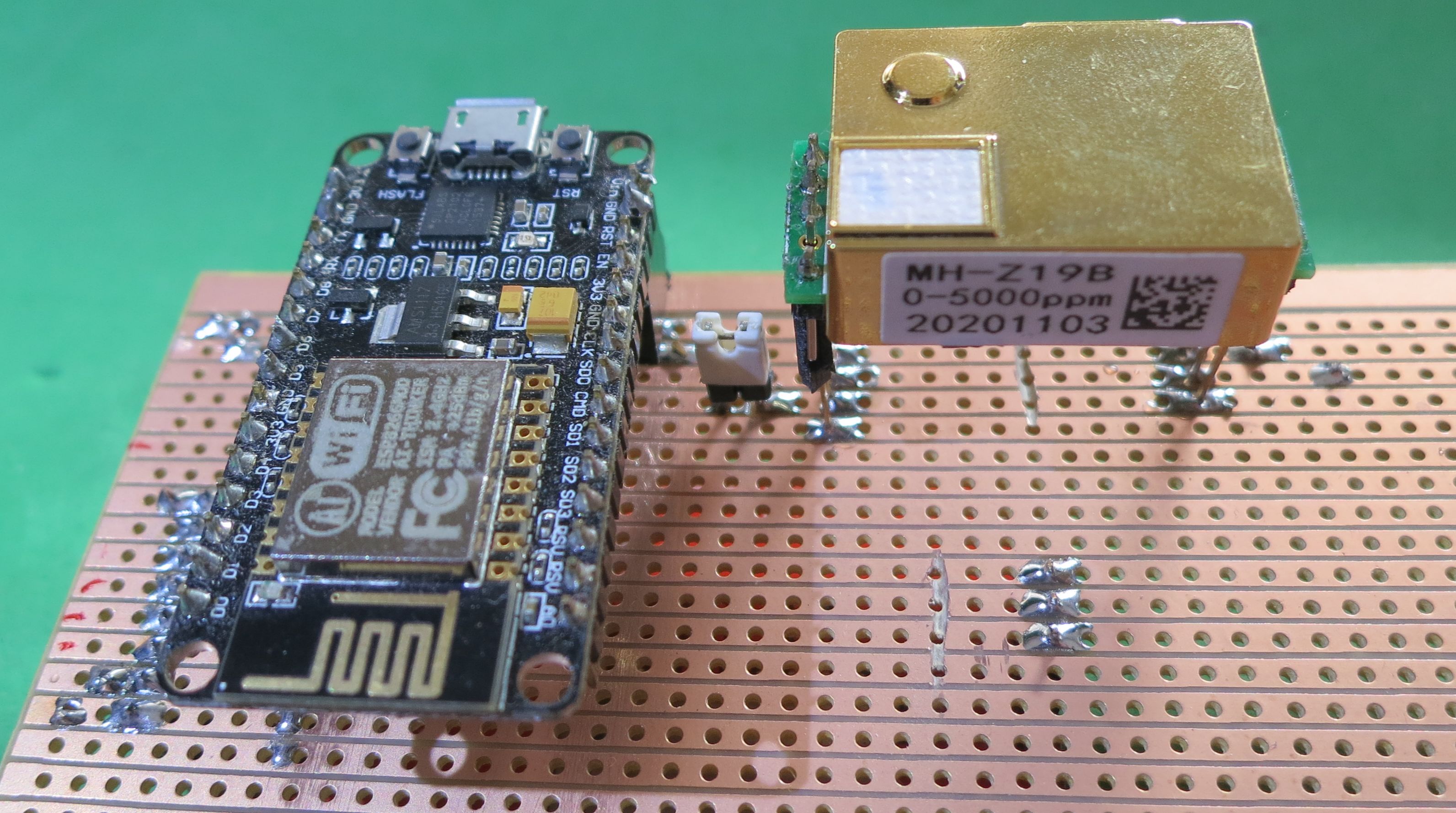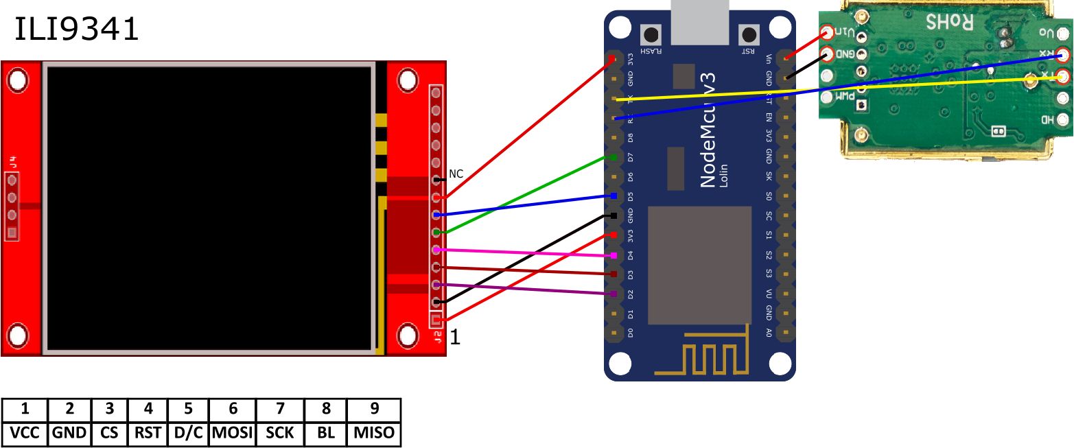 El conexionado es bastante sencillo. Aparte de la pantalla, el MHZ19 se comunica por serie con el microprocesador. He usado el UART serial del Nodemcu, eso significa que para cargar el código se quita el MHZ19 o se quita el puente que une el Rx del Nodemcu con el Tx del sensor. No es necesario quitar el del Tx.