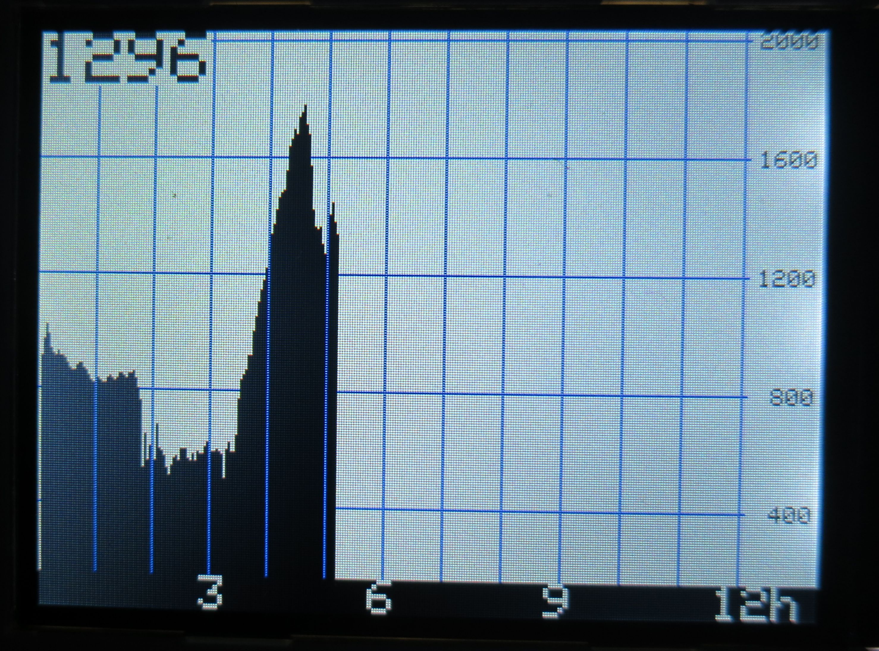 A unos 50mts de una carretera con bastante tráfico, aunque libre de edificios en uno de los lados, en un tercer piso y viento en calma, marca cifras que oscilan sobre 500 a 600ppm. La gráfica superior cubre 24h con un máximo por la tarde. Recuerdo que es una carretera bastante abierta, en una ciudad serian cifras mucho más altas.