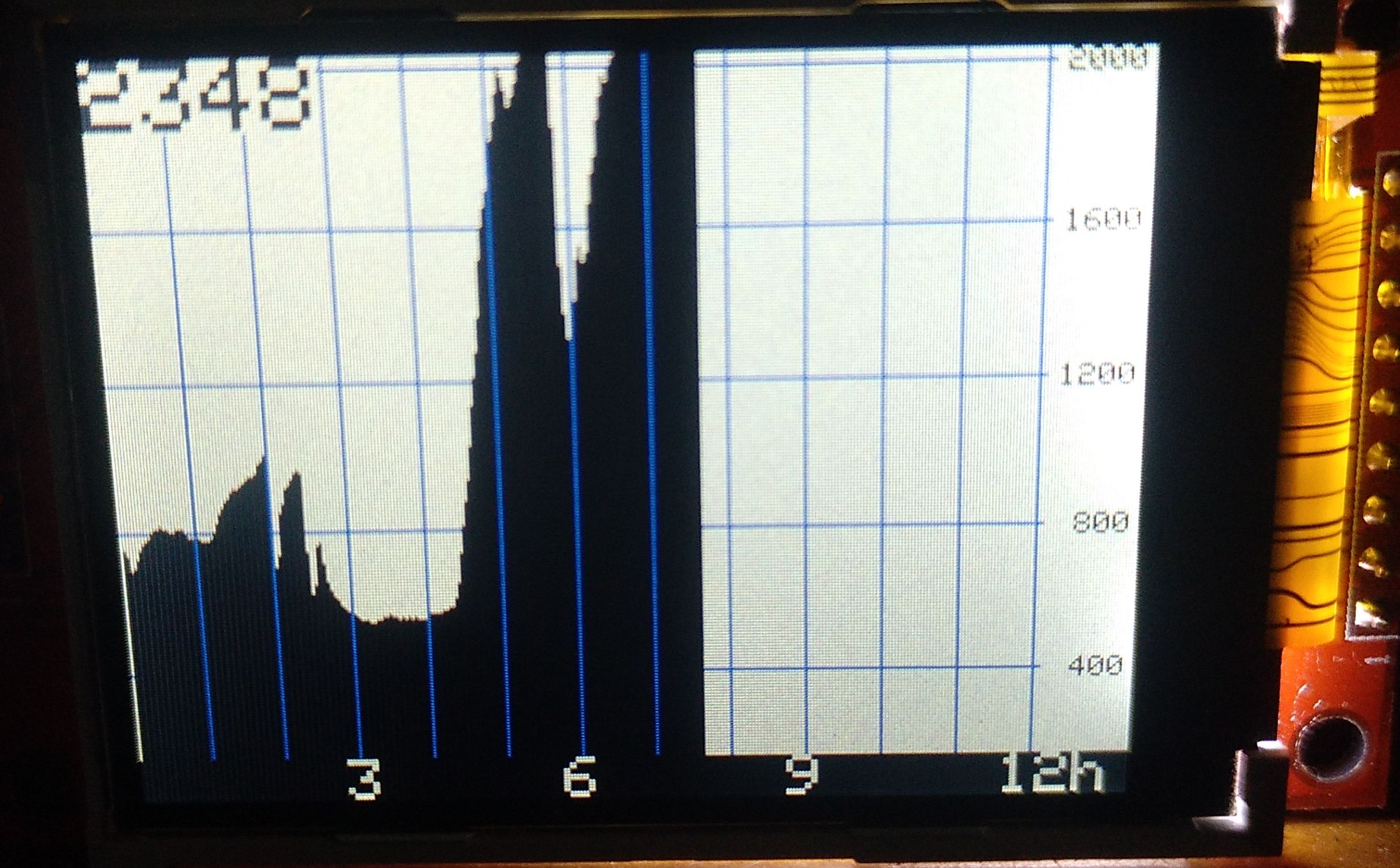 Este medidor está basado en el sensor MHZ19B que mide hasta 5000ppm. Tiene una excelente sensibilidad y precisión. Se alimenta a 5v y tiene salida de datos por serie y PWM. La gráfica del montaje la he limitado a 2000ppm, aunque continua marcando las cifras numéricamente en pantalla.