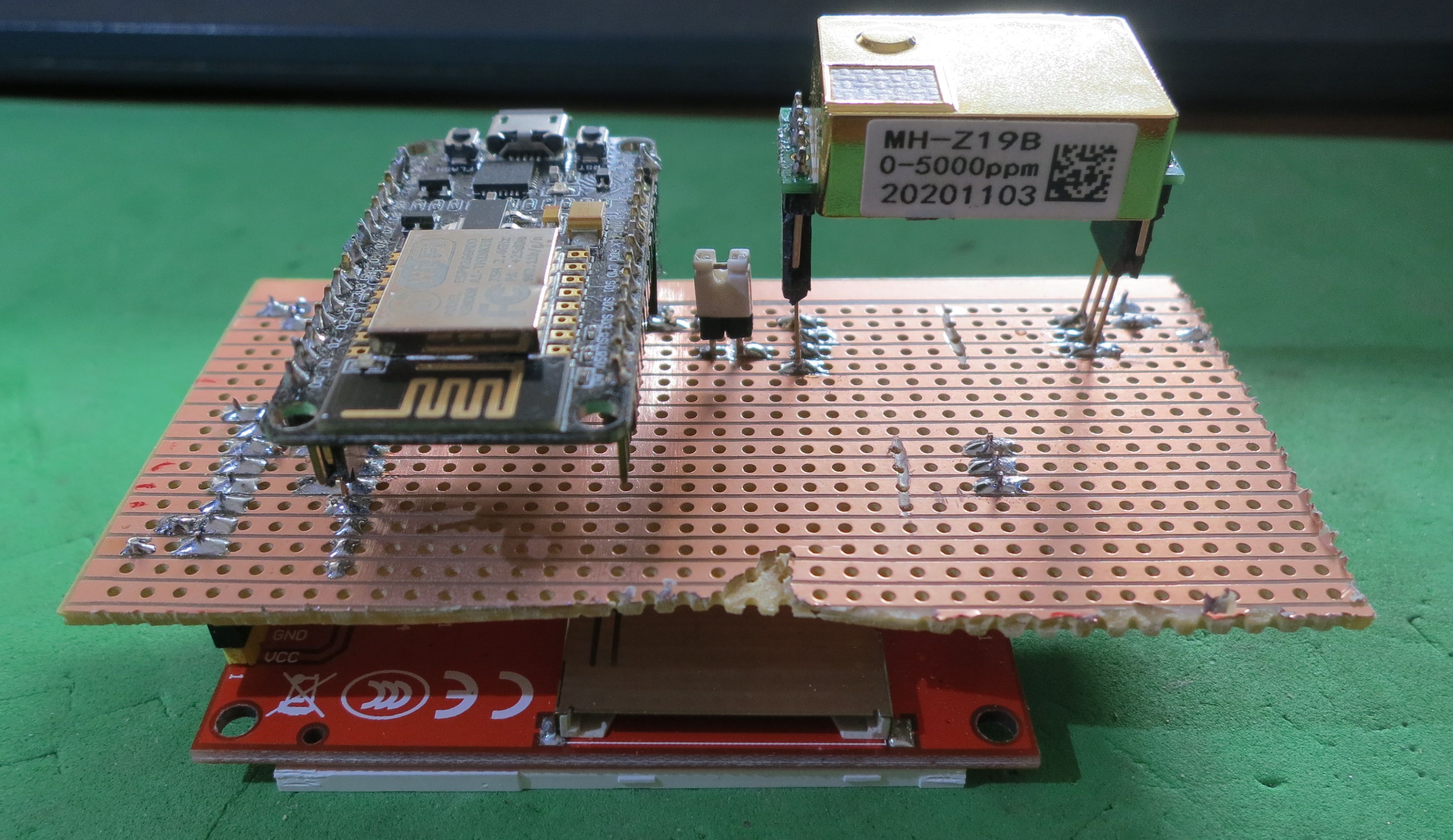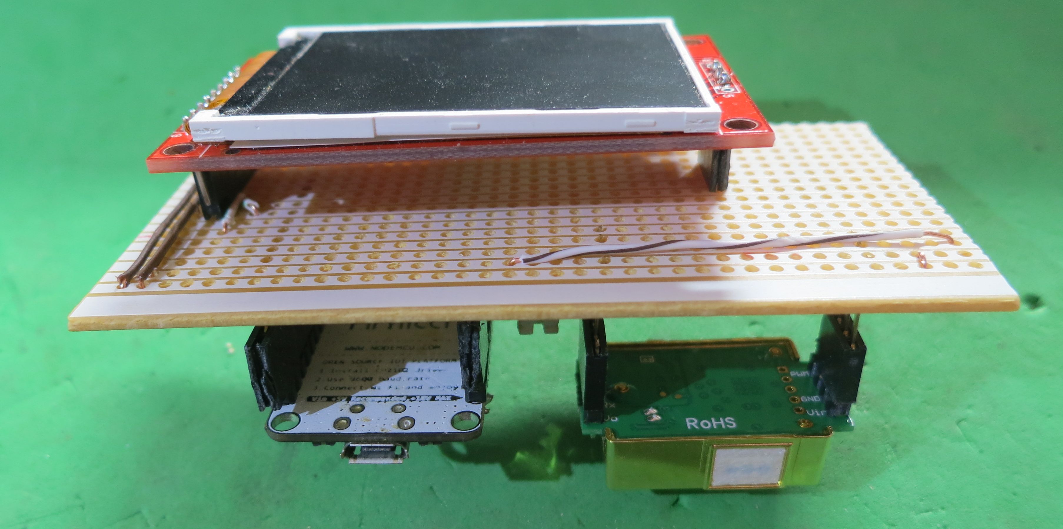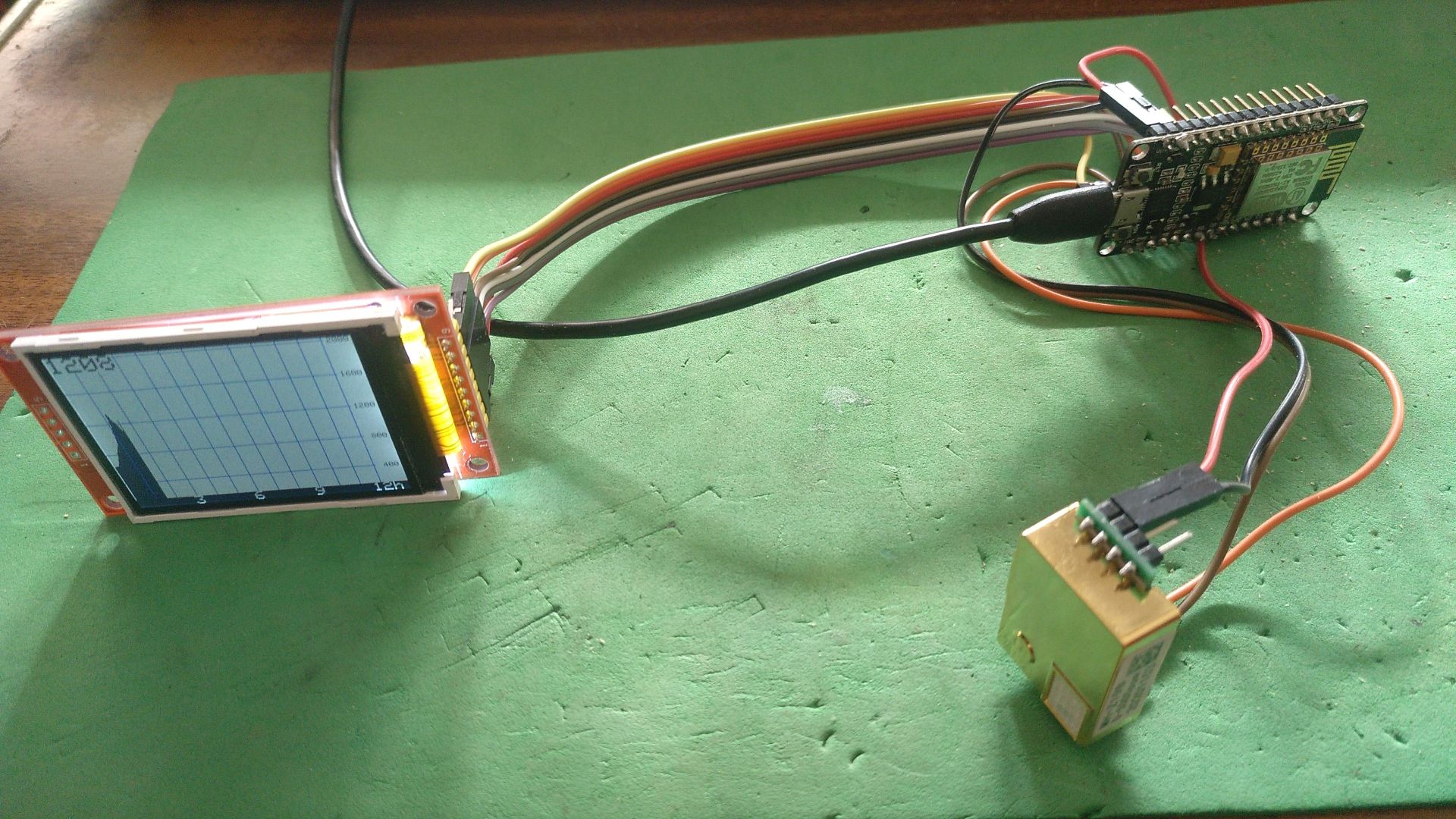 El sistema consta del sensor MHZ19, una pantalla de 2,2 pulgadas (resolución de 240x320) y un Nodemcu V3 por la posibilidad de enviar los datos via wifi si así se deseara.