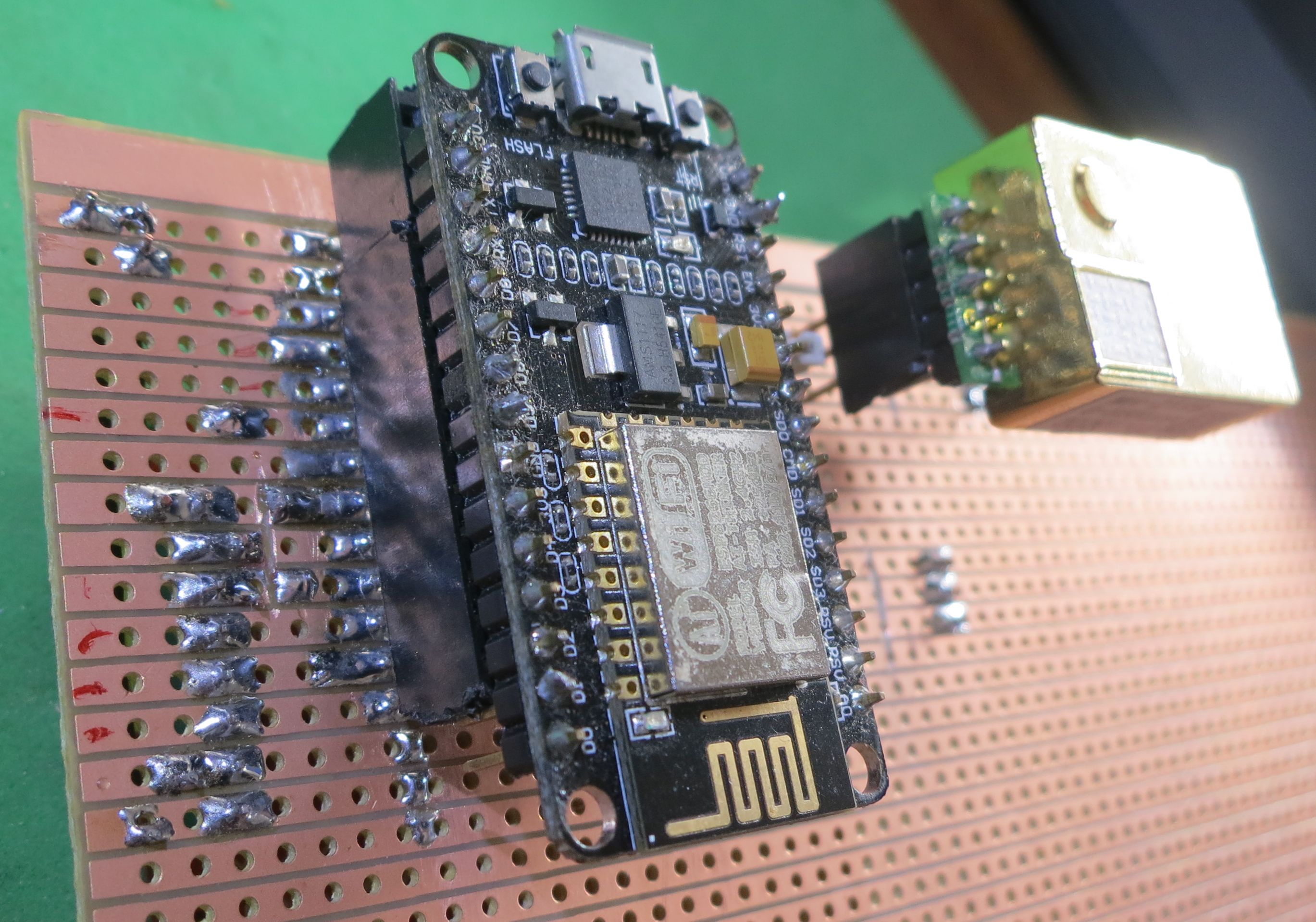 El circuito lo he montado en una placa de tiras. Hay que tener en cuenta que el Nodemcu y el sensor están soldados por el lado del cobre de las tiras. Es decir, en la imagen inferior estos dos componentes están detrás de la placa.