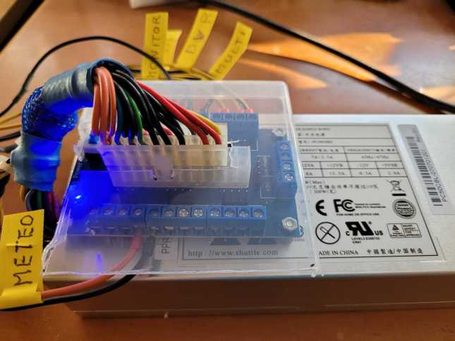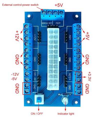 Lo encontré en Aliexpress como Adaptador de corriente ATX DC de 24/20 pines. Aparte de las salidas atornilladas, tiene númerosos conectores tipo espadín.