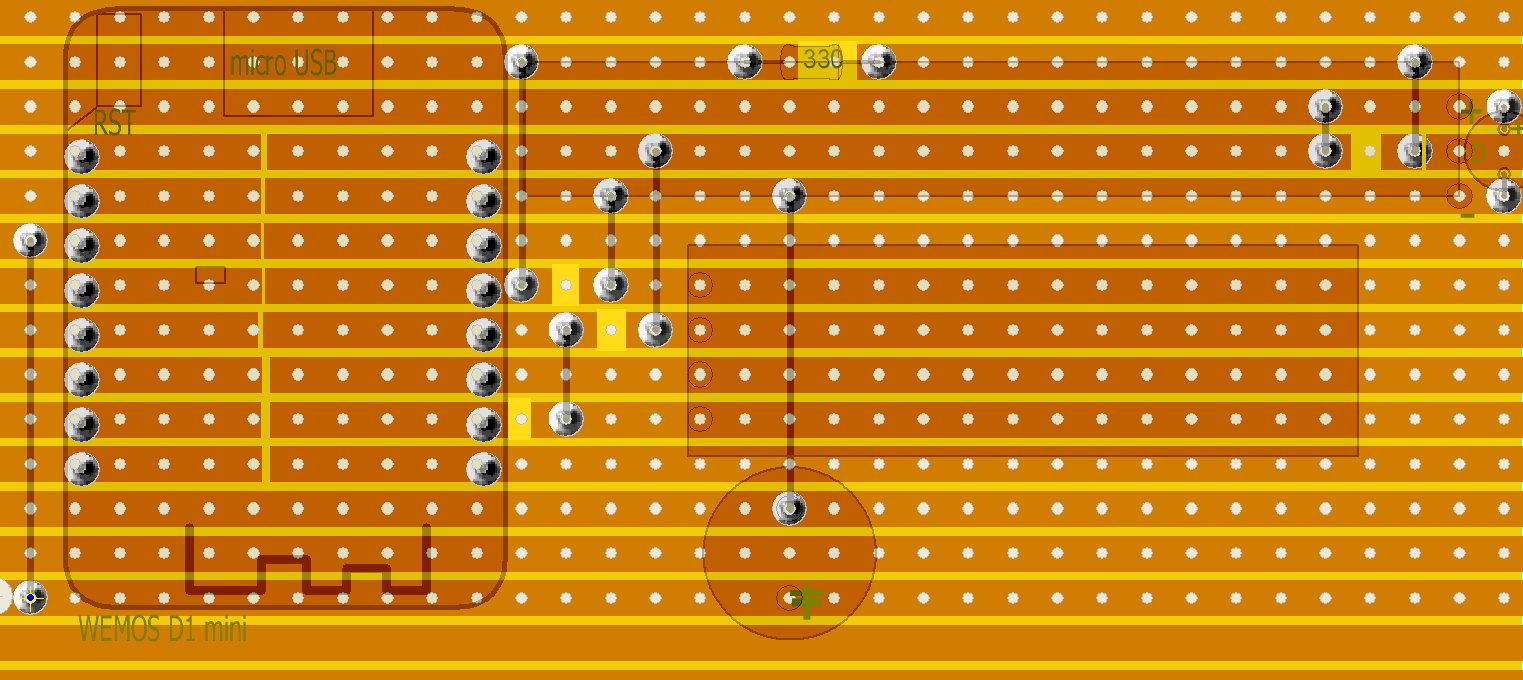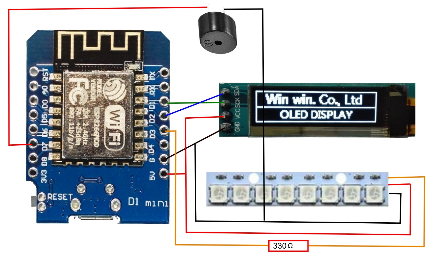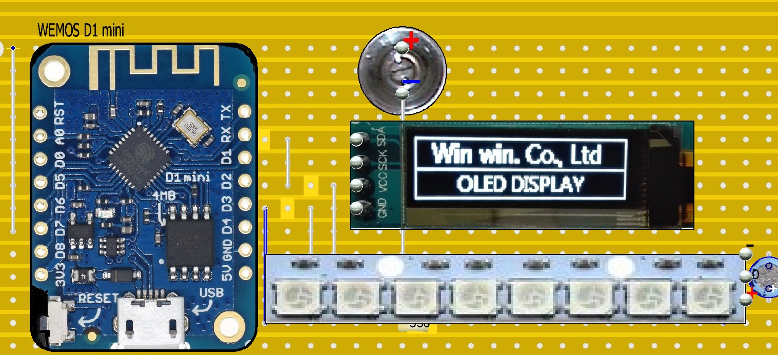 Del esp8266 solo se necesita tres pines de control. Dos I2C para controlar la pantalla y solo uno para manejar la tira de 8 diodos LED ya que son del tipo WS2812 5050 RGB. El módulo usado se vende de 8 LED, pero puede usarse de tiras largas cortándolas.