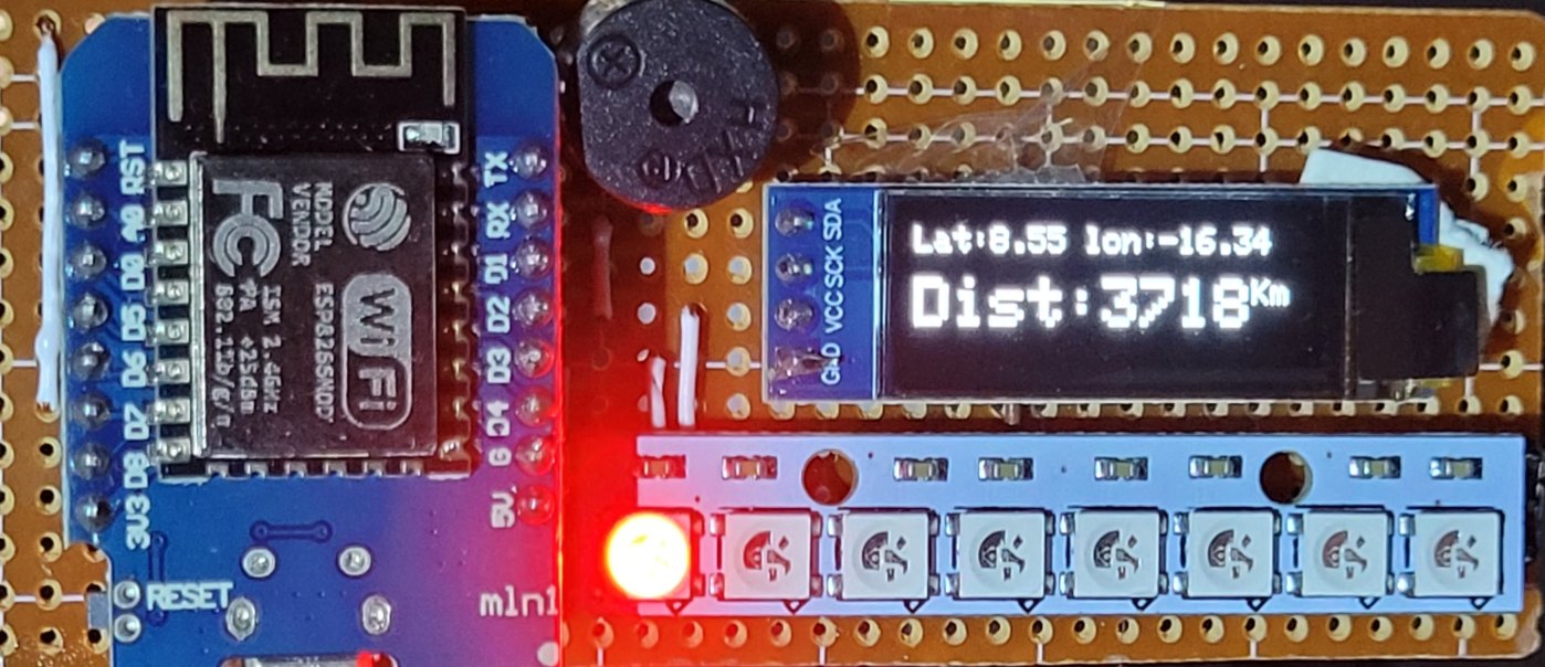 El circuito trata de hacer un seguimiento de la Estación Espacial Internacional (ISS) avisándonos cuando se acerca a nuestra situación en la Tierra por medio del encendido secuencial de ocho LEDs. Una pantalla nos informa de la distancia a la que se encuentra así como su posición de coordenadas latitud y longitud.