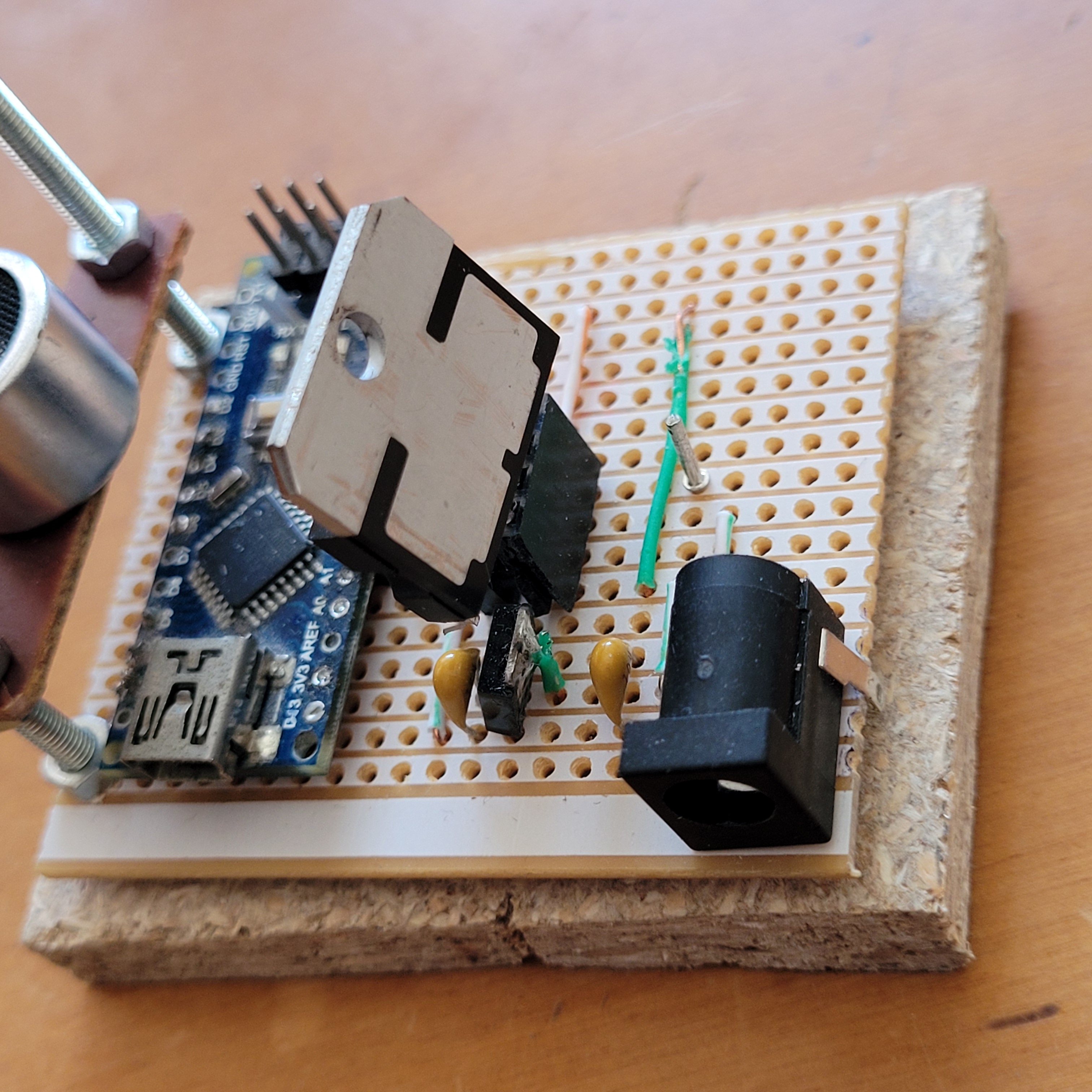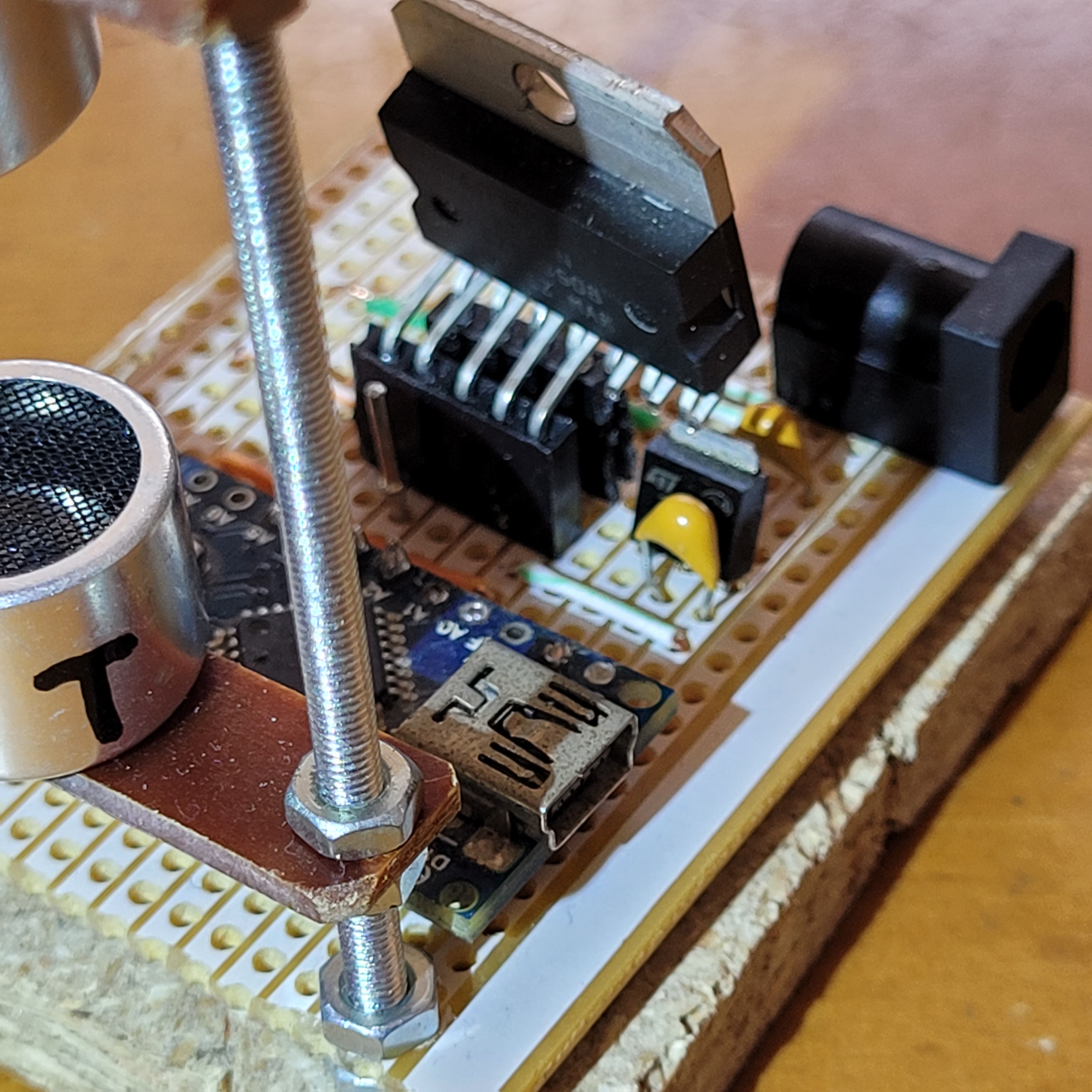 He usado un Arduino nano, el L298 está instalado sobre una especie de zócalo hecho con los conectores que habitualmente tiene el Arduino Uno en los pines. Las dos salidas del L298 están unidas por debajo de la placa a las varillas roscadas que sostienen los dos transductores, que están sujetos con dos trocitos de circuito impreso que deben ser perforados estando totalmente unidos para que luego queden perfectamente alineados el uno con el otro. La distancia entre los transductores la he puesto a 21,7mm.