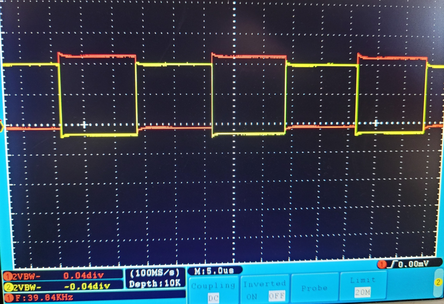 Con el osciloscopio en cada varilla (salida del L298) se observa una salida en oposición de fase de OUT1 y OUT2.