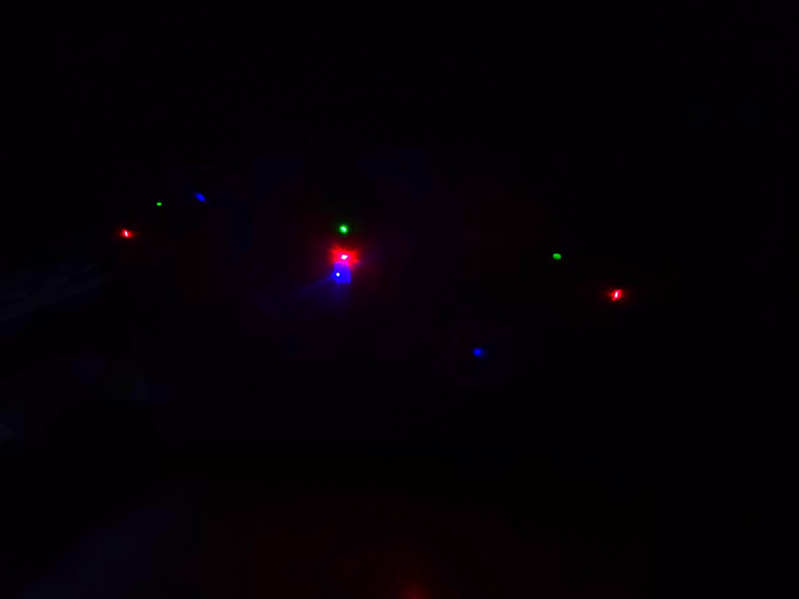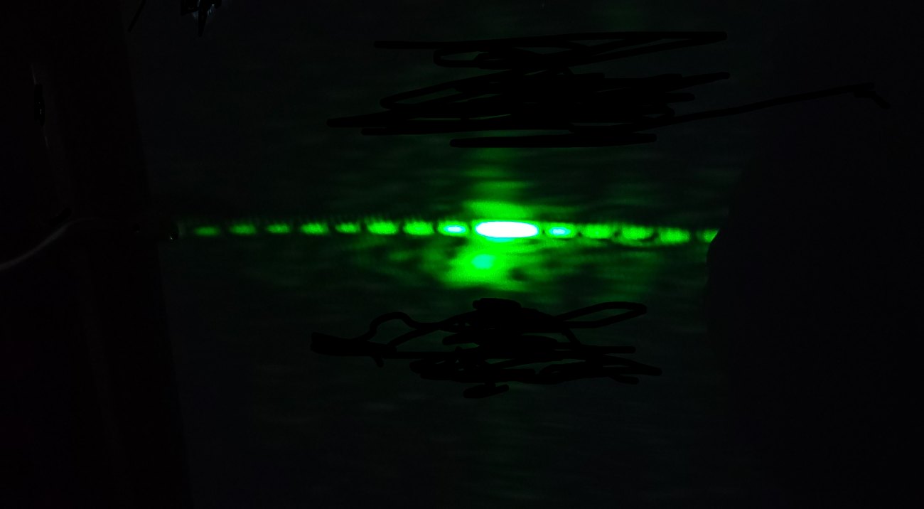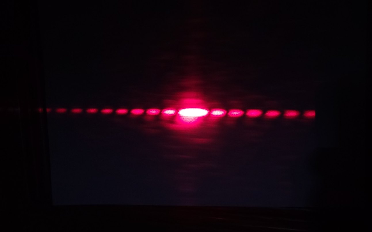 Aquí hago el sencillo experimento de la doble rejilla, en donde como intuitivamente cabria esperar dos líneas de luz proyectadas, nos encontramos con un patrón de interferencia típico de un frente de ondas que interfieren formando picos y valles de intensidad lumínica.