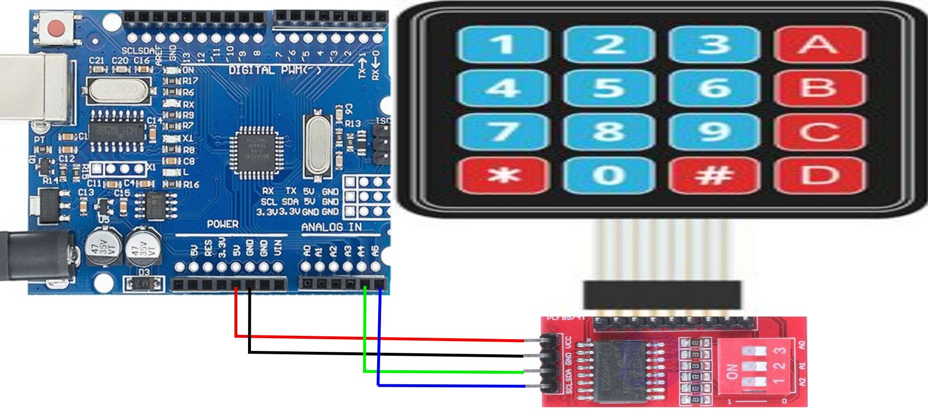 Aunque usaré dos librerías para manejar un teclado y otra para entradas y salidas, estrictamente no las necesitaríamos ya que escribir o leer del I2C es sencillo. En primer lugar usamos este montaje.