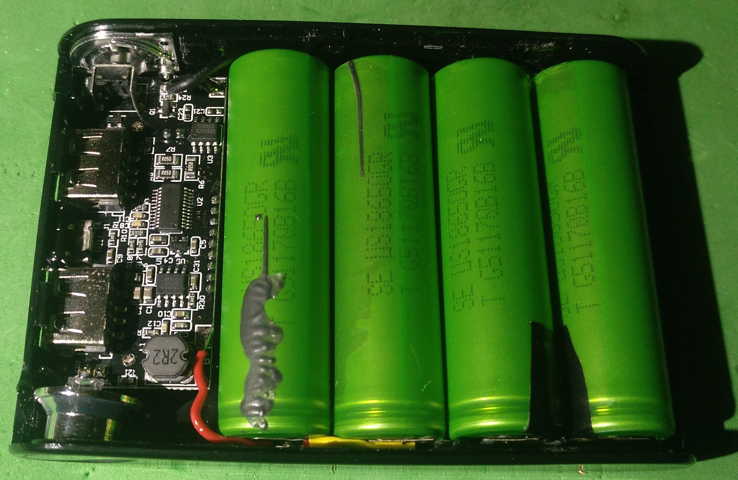 Las pilas rescatadas de portátil suelen venir soldadas dos a dos en paralelo. En total unir 4 pilas, TODAS en paralelo dando una tensión 3,7v. El circuito controlador se encarga de elevar y estabilizar el voltaje a 5 voltios.