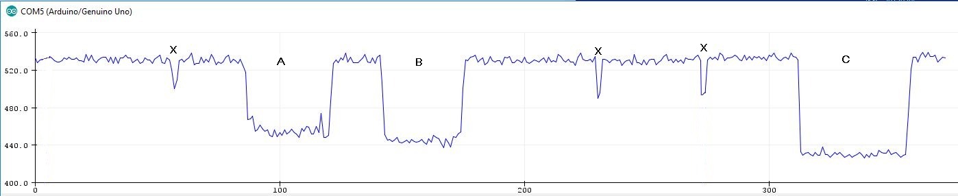 Aquí vemos los valores RSSI capturados del pin 13 en la entrada analógica A0 del Arduino. Los valores mas altos son con el transmisor apagado o muy alejado. En "C" encendido muy cerca del receptor, "A" y "B" en dos habitaciones distintas separadas por pared fina. Las "X" creo que corresponden a un sensor meteorológico que tengo en una terraza.