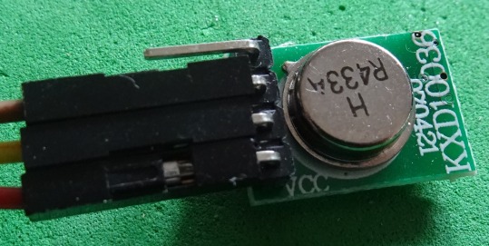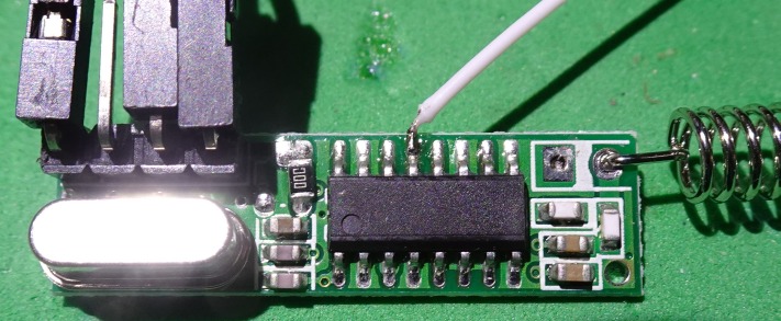 He usado módulos baratos de 443Mhz, transmisor y receptor. Hay que asegurarse que el receptor usa el chip SYN470R aunque en mi módulo el nombre estaba borrado. Es un chip de 16 patillas, el número uno está marcado con una señal grabada en el plástico del chip.