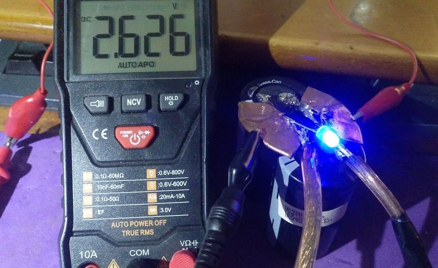Directamente a los terminales hay conectado un LED azul sin resistencia limitadora. No hace falta ya que de ese color comienza a brillar levemente a partir de 2,5v y bastante brillante a 2,7v pero con un consumo de menos de 20mA totalmente seguro para el LED. Es un indicativo de nivel de carga muy simple sin necesidad de usar voltímetro.