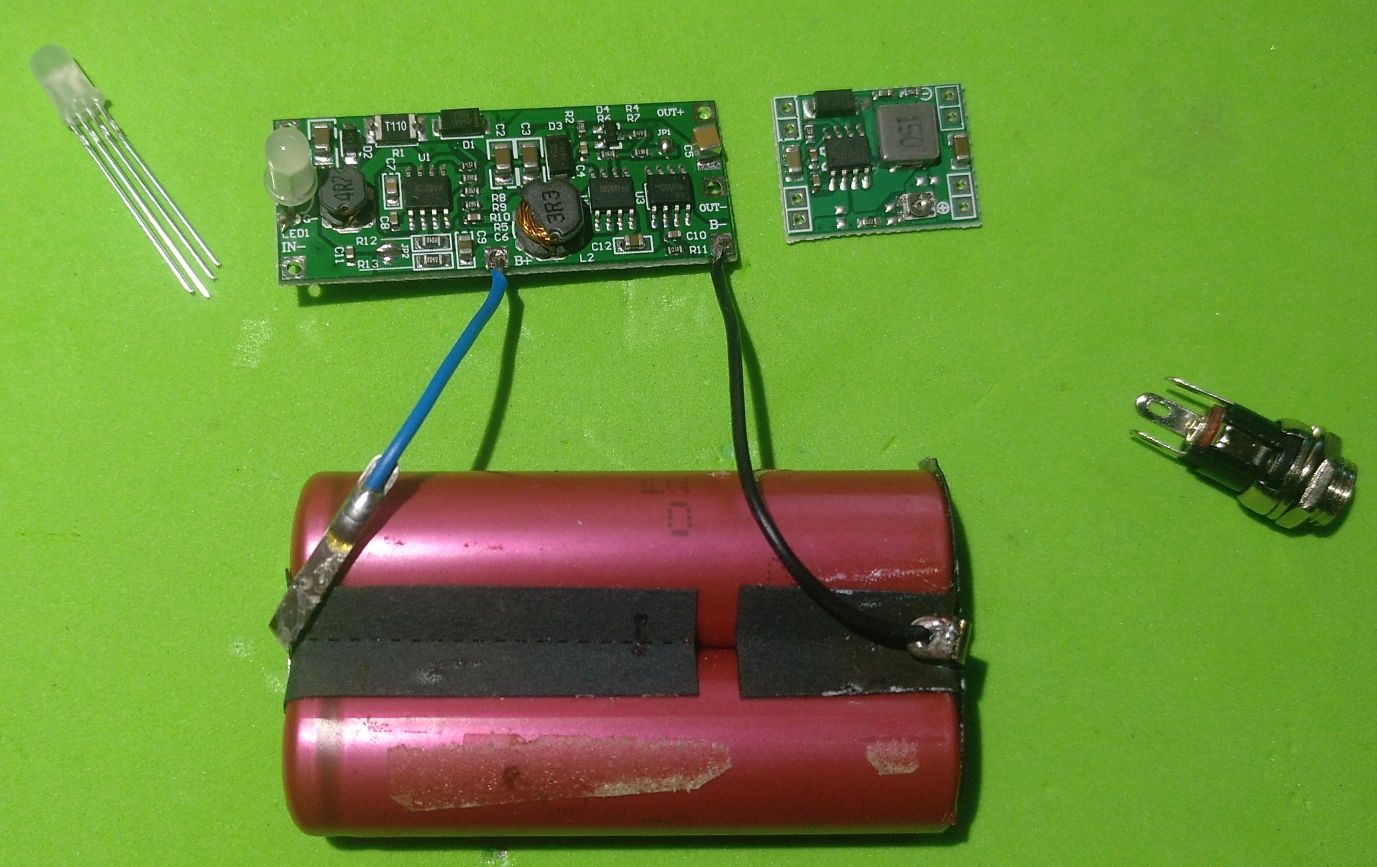 Los componentes son el módulo UPS con salida de 12v (comprado en Aliexpress), un Step Down para bajar de 12 a 5v, pilas de litio, diodo bicolor de ánodo común (yo tenia uno RGB y corté la patilla del azul).