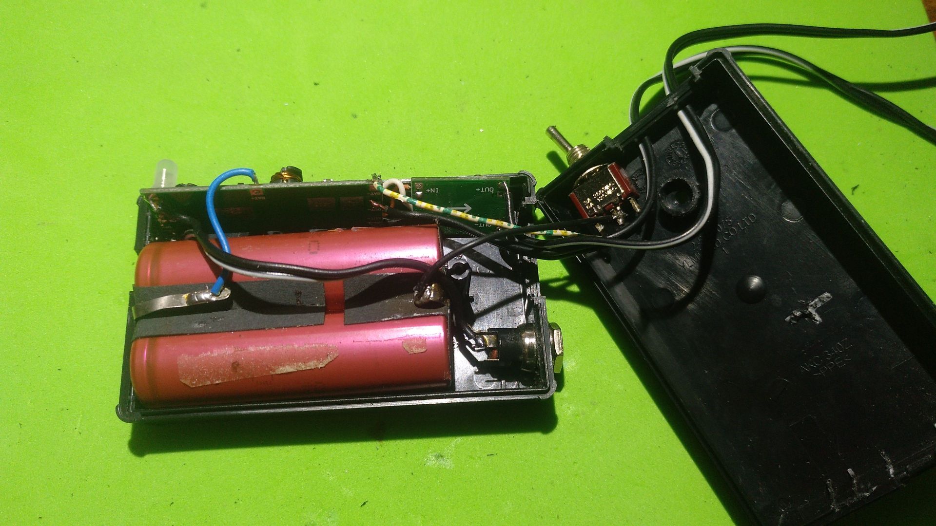 Decidí añadir un interruptor para desconectar la pila si no vamos a usar el sistema largo tiempo para evitar su descarga ya que el circuito UPS y el Step Down tienen un consumo aún sin carga (aunque es mínimo). He conectado los dos cables de salida directamente a los módulo y terminan en los correspondientes conectores para 12 y 5v.