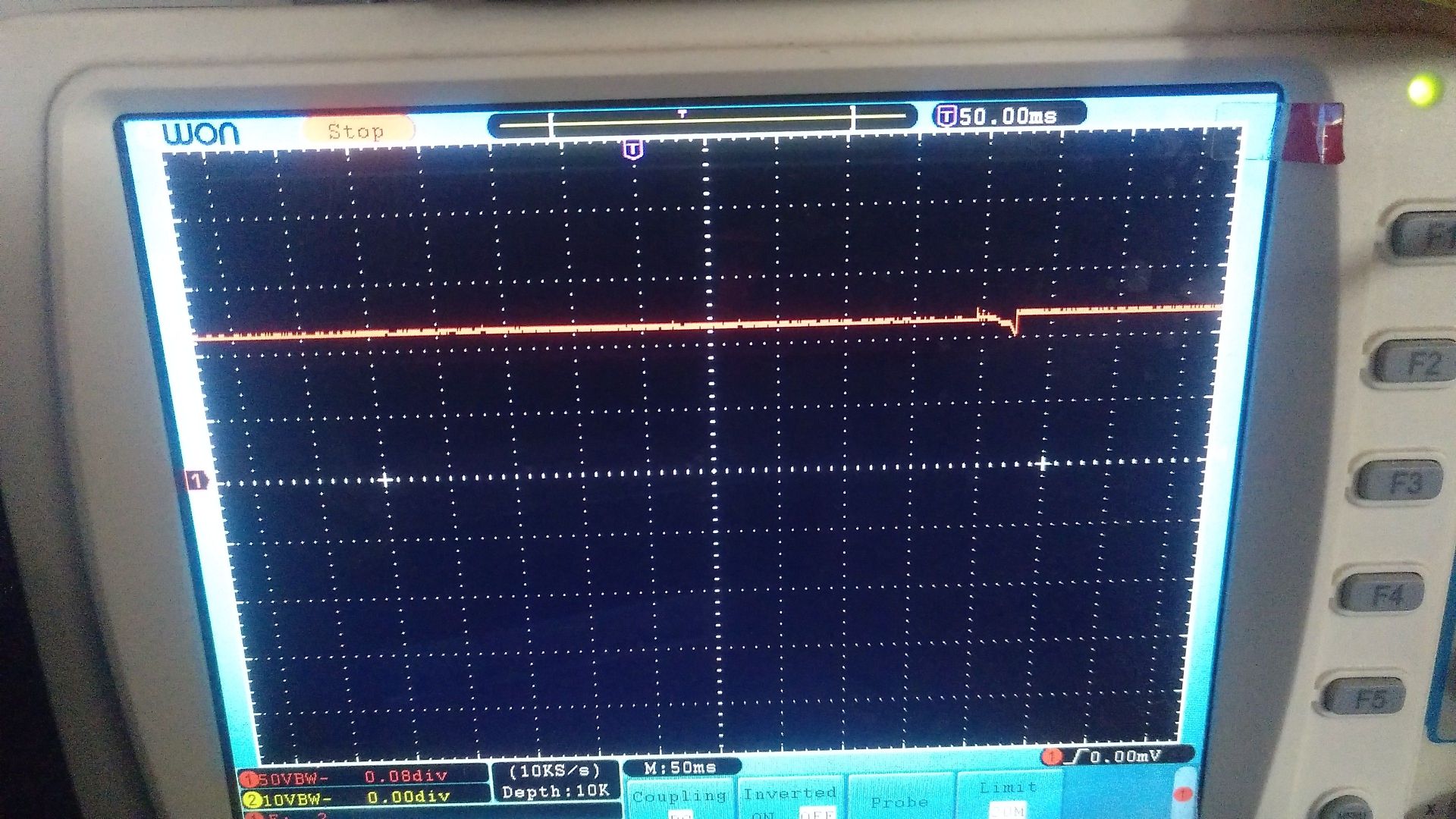 El sistema se comporta muy bien y la conmutación de alimentación de red a UPS es casi instantánea sin caída apreciable de tensión (2v) como vemos en la captura del osciloscopio.