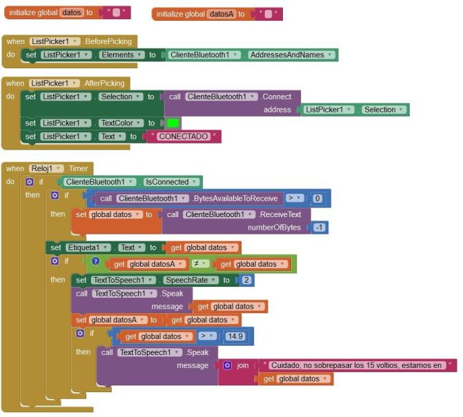 La aplicación para Android en App Inventor conecta con el BT y dice el valor recibido cuando hay un cambio. También avisa si medimos más de 15V. Podriamos modificar la parte de elección de BT y fijarlo solo para el nuestro y que conecte nada mas arrancar la aplicación.