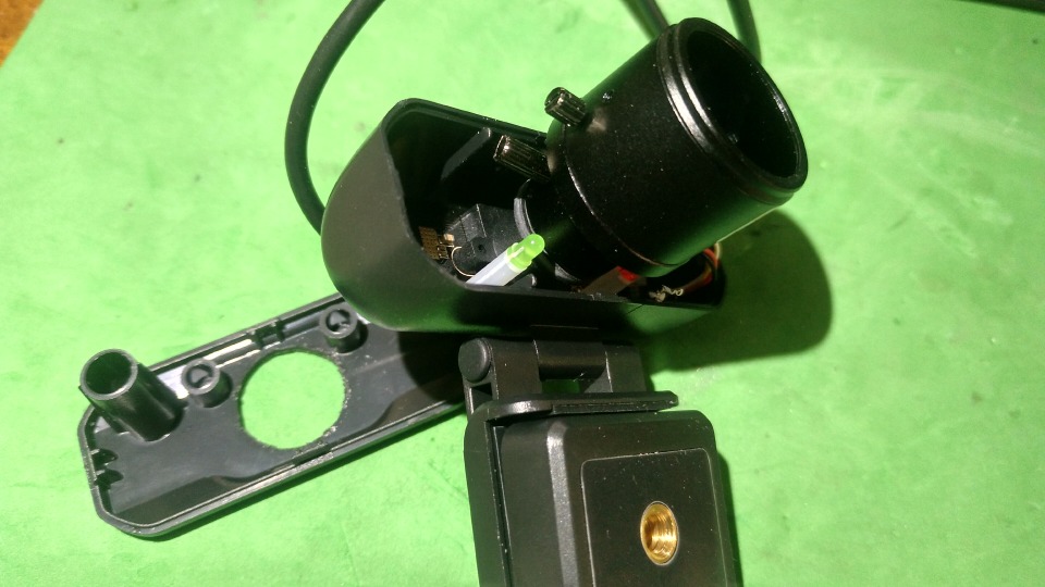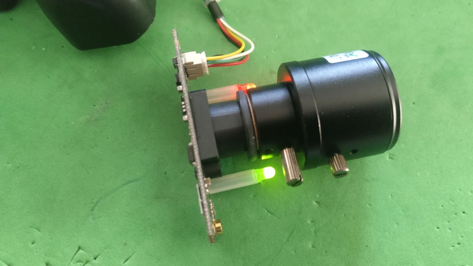 La nueva lente montada para pruebas. Hay que enroscar la lente en su soporte hasta un punto que permita el enfoque perfecto en todo el rango de zoom. El tornillo delantero es para enfocar y el trasero para el zoom. Hay que hacer pruebas con el zoom al mínimo y al máximo y poder enfocar con el delantero. Si no podemos hay que enroscar más o menos en el soporte de la lente. Una vez encontrado ese punto debe fijarse. Lo mejor es dos o tres vueltas de hilo de coser muy fino para que al enroscar esta quede firme.