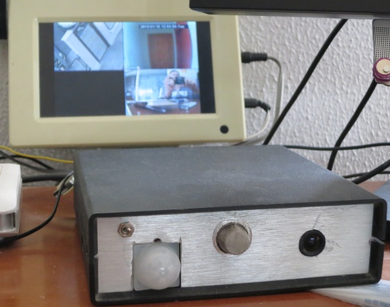 En la izquierda el montaje ya terminado. En el fondo se ve una pantalla para ver fotos, que afortunadamente tiene entrada de video y está conectada a la salida de video del DVR. La caja y esta pantalla están en mi "despacho". Por cierto, tengo otro mando con el receptor metido dentro del telefonillo (fonoporta) y puedo abril la entrada al edificio sin moverme del sillón ya que veo quien llama. Vale vale alto, en mi descargo tengo que decir que tengo movilidad reducida.