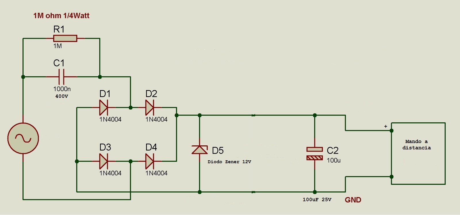 El circuito adjunto, solo puede proporcionar unos pocos miliamperios, pero son suficientes para activar el transmisor. Esta construido en una pequeña plaquita de circuito y dentro del propio timbre. Salen dos cables para alimentar al transmisor.
