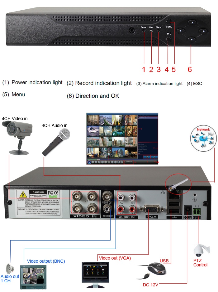 El corazón del sistema de gestión de video es un DVR que puede comprase (como todo lo demás) en Chinalandia por unos 80 euros (a 2013). Nos permite conectar hasta 4 cámaras normales (no cámaras WEB) al router y lógicamente de ahí a Internet y al móvil Android o iPhone. Este es el "bicho"