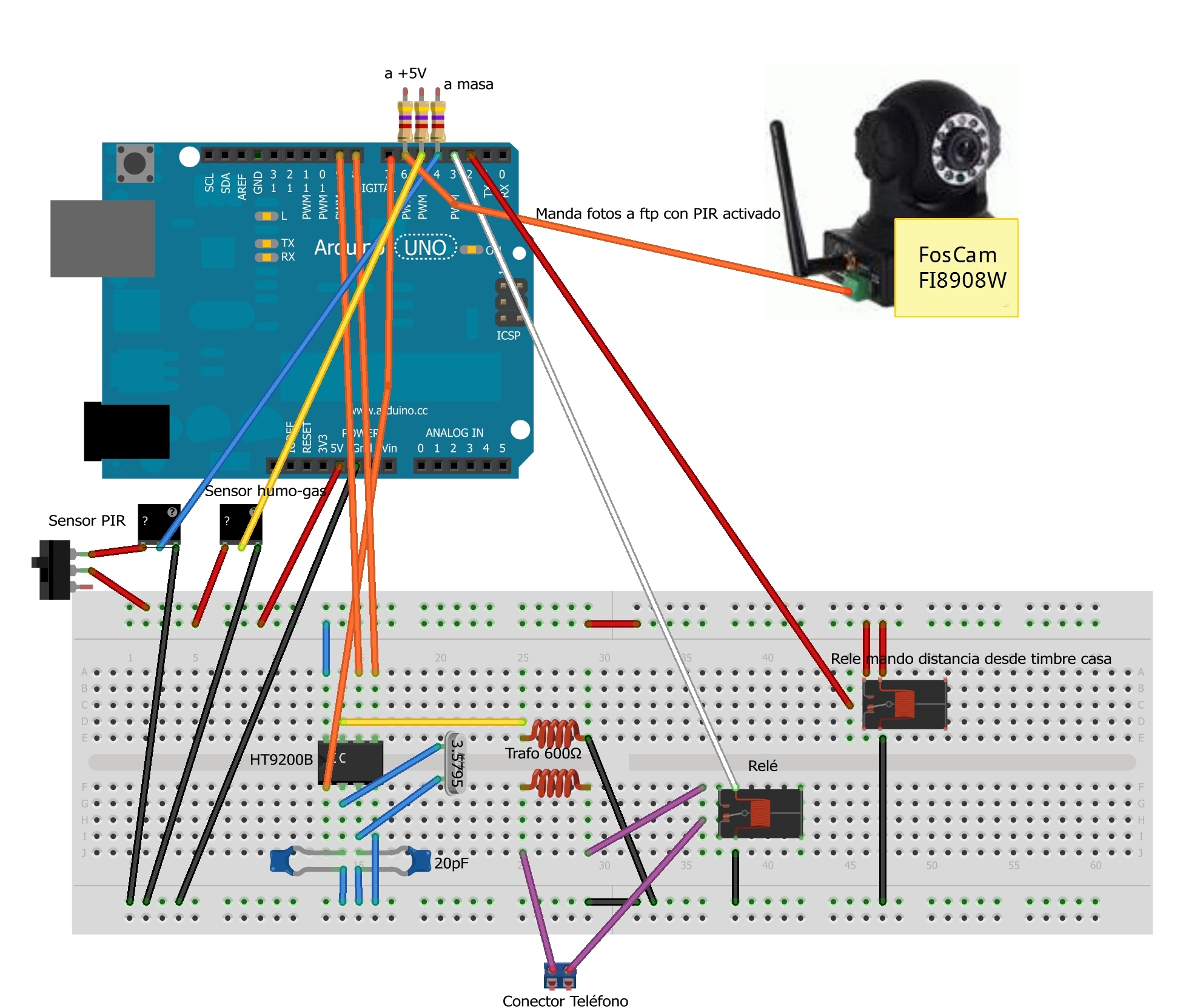 -Una cámara Web. La tenía y la conecté. Arduino le manda un impulso solo cuando hay una alarma PIR y entonces tomas fotos cada segundo que envía a un servidor de ISP (Telefónica).