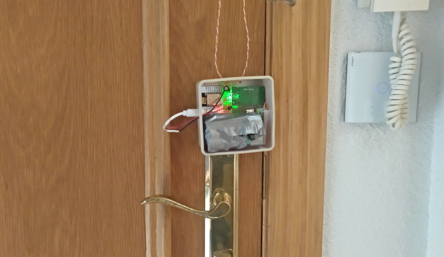 El montaje alimentado con pack de pilas recicladas y colocado en la puerta. Se debe regular la sensibilidad para que detecte personas que se acerquen mucho al sensor de forma no habitual y que podrían estar manipulando las cerraduras. La puerta era blindada pero en la parte lateral no, por lo que el sensor podía funcionar. Apuntar que en este caso, la mirilla del domicilio esta conectada a internet y es visible en el móvil en caso de recibir la alarma Telegram.