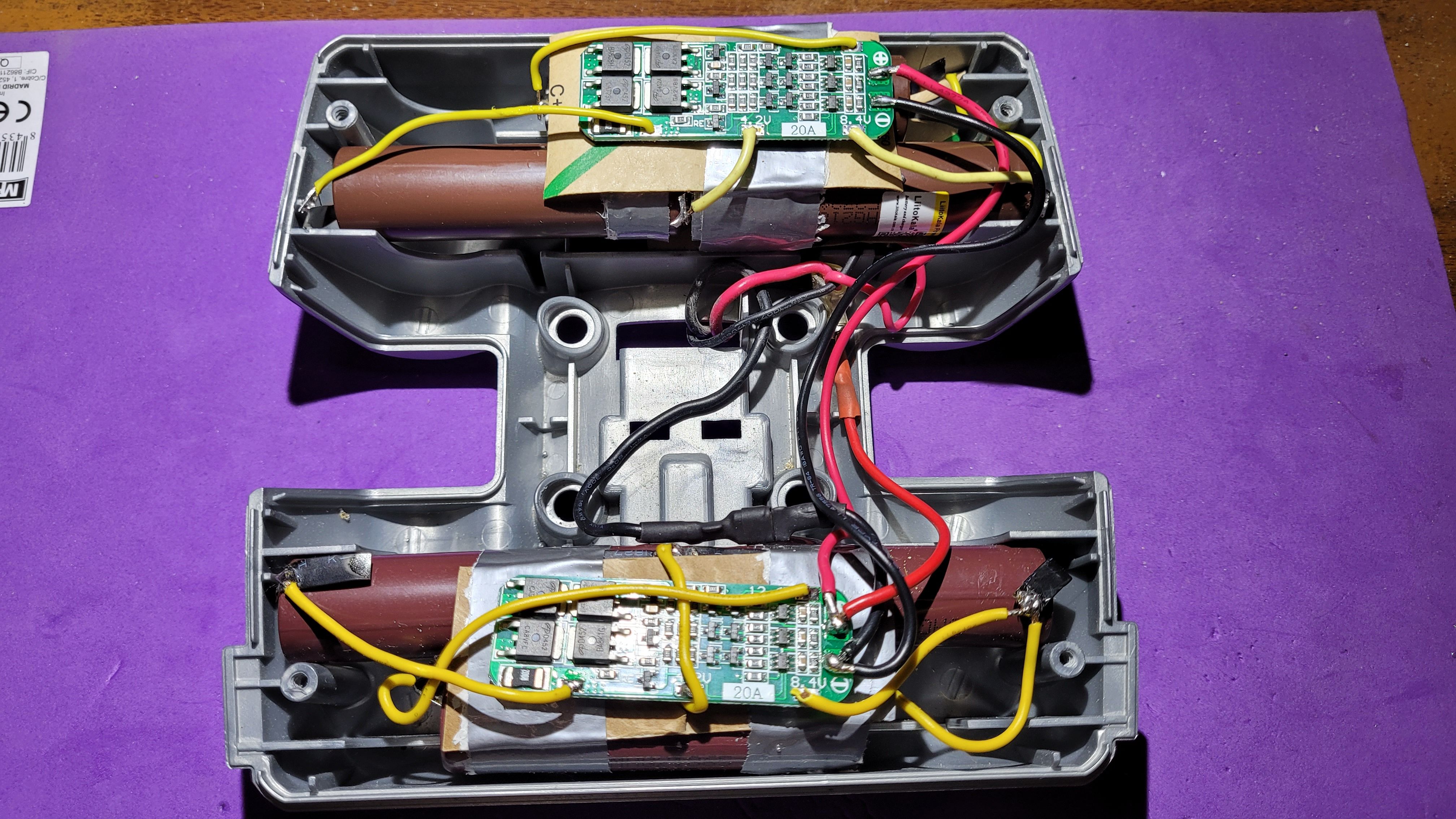Las baterias de litio (2,7v) necesitan un controlador de carga individual para cada una de ellas. He usado uno que puede dar hasta 20A al motor que suele gastar unos 8-10A.