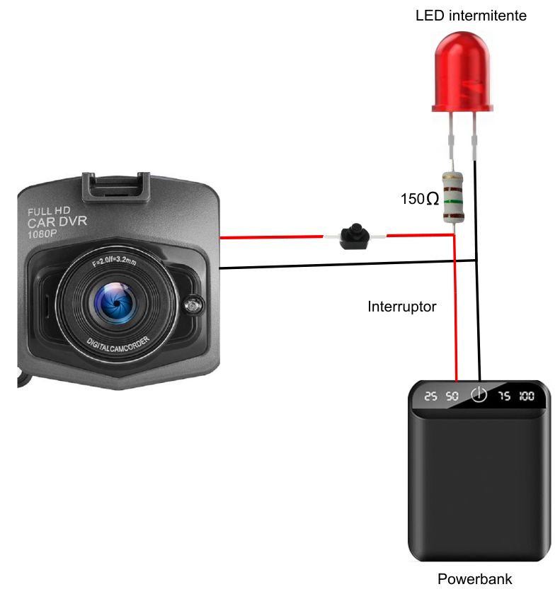 El sistema lo forman la cámara, un powerbank, un interruptor y un diodo LED. Yo he usado un LED intermitente, es simplemente de recordatorio para apagar la cámara.