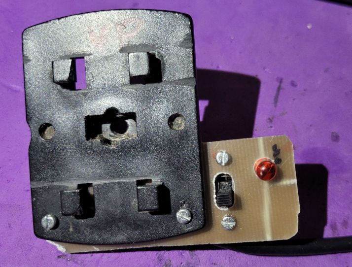 El interruptor, resistencia (SMD) y el LED están soldados en una plaquita de circuito impreso, así como los cables que vienen del powerbak y los que van a la cámara.