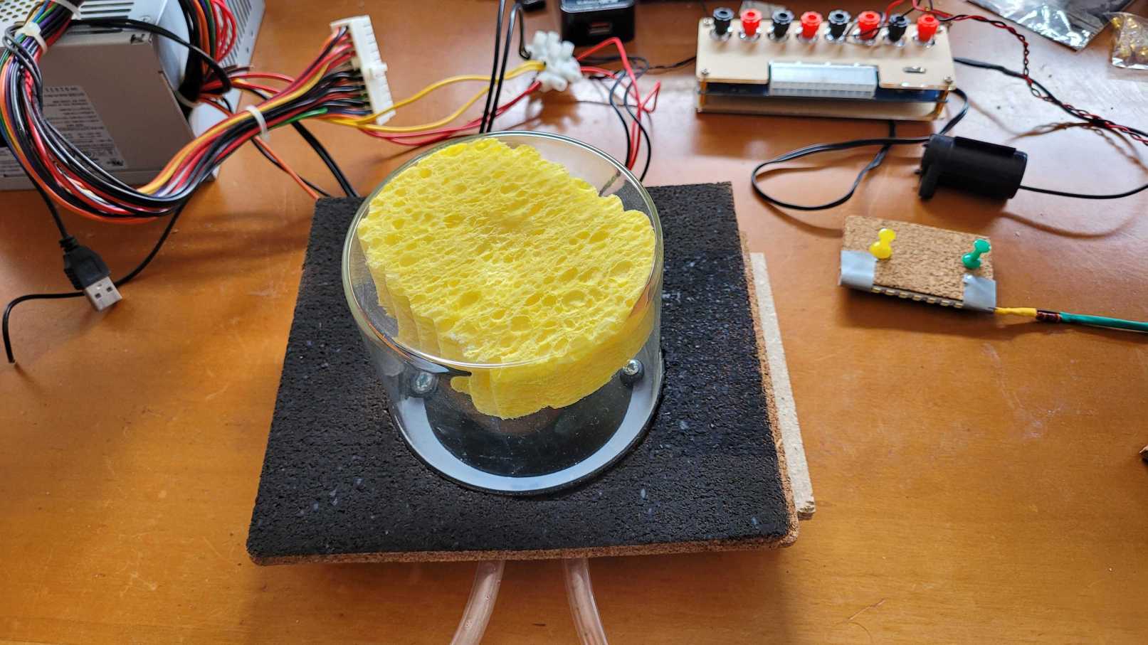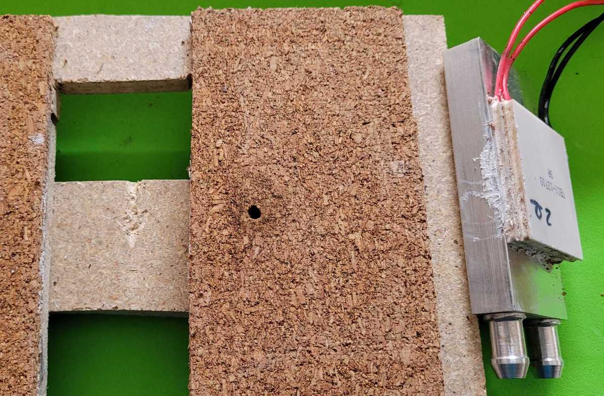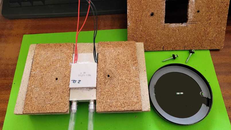 -Corcho, maderas, bote de cristal con tapa metálica y spray negro del chino de España. -Refrigerante de aluminio, tubo de goma, pasta térmica y alcohol isopropílico de Amazon. -Dos placas Peltier de 10A (TEC1-12710) y bomba de agua del chino de Chinalandia. -Fuente vieja de PC. -Piedrecita de mineral radioactivo que yo llamo Uraninita pero que no sé su composición exacta ya que emite otras partículas además de alfa y que compré por eBay hace muchos años. Usando este mineral permite ver muchas más trazas por minuto que si solo esperamos las de radiación de fondo (que suelen ser de unas 21 por minuto contadas con este montaje geiger anterior.