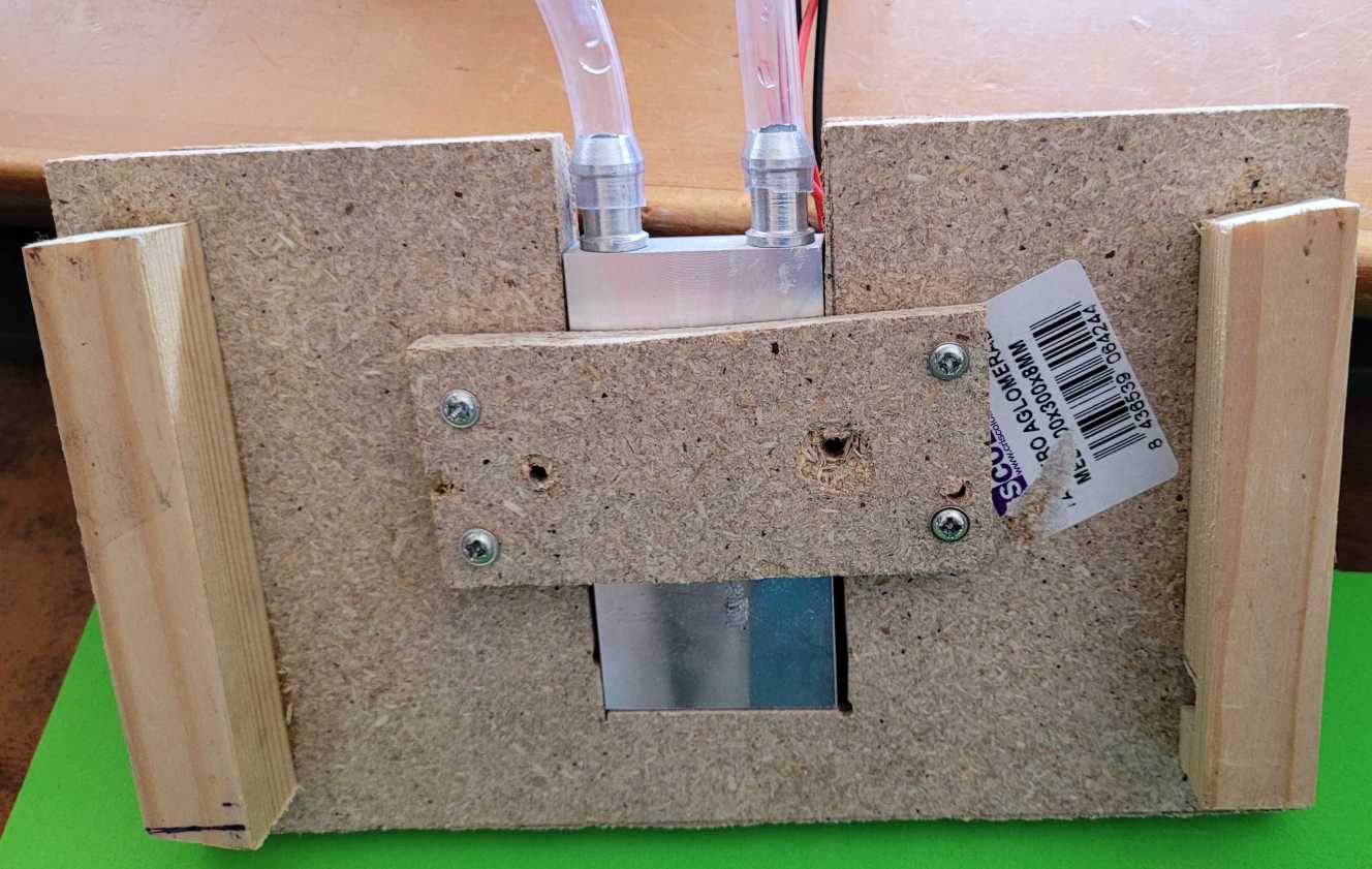 El disipador por agua con las dos Peltier superpuesta con pasta térmica.La inferior se alimenta con los 12v de la fuente PC y la superior solo con 5v para no sobrecalentarla.