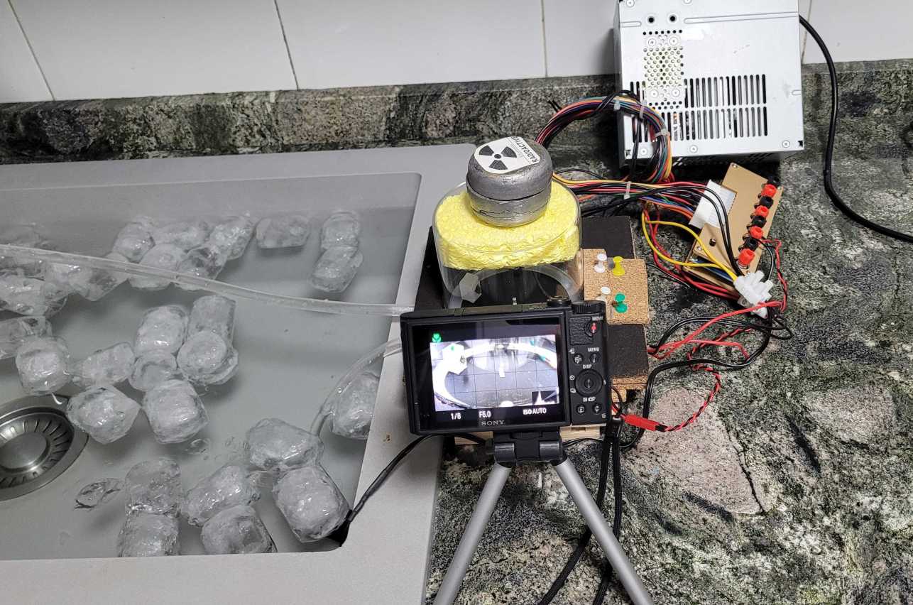 El multímetro mide temperatura con un termopar en el aluminio refrigerante que ingresa agua a casi cero grados y se calentaba a unos 20ºC. El plomo sobre el vidrio es para asegurar la estanqueidad. La cámara está en modo enfoque manual, en automático tiende a enfocar el cristal y no el fondo del tarro donde están las trazas.