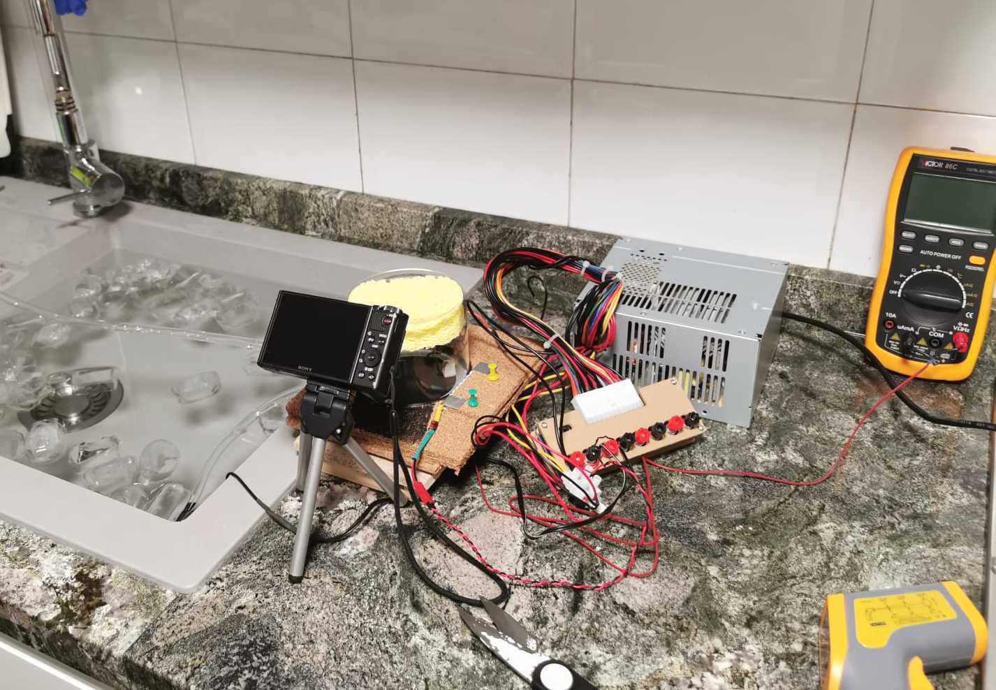 Temperatura de -34,6ºC. En otras mediciones recién quitado el cristal marcaba -38,5ºC. Vemos que para conseguir estas temperaturas el consumo es tremendo. Casi 1 amperio, es decir 230W. Útil, pero muy ineficaz. Y además usando agua de refrigeración con hielo.