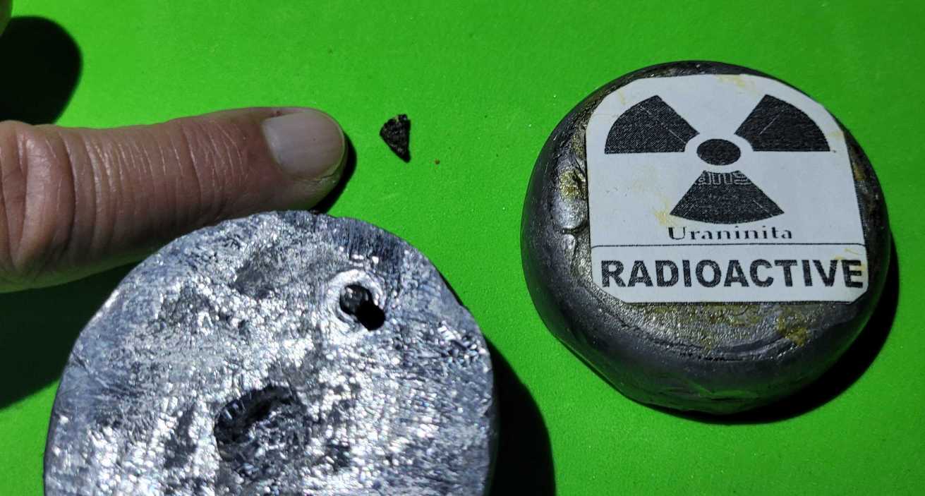 Bomba de agua y tira de mini LEDcon resistencia. Piedra de "uraninita" con su cofre de plomo.