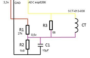 El ESP8266 mide esa tensión muchas veces por su terminal analógico quedándose solo con el valor positivo más alto. Este valor se multiplica por un factor para obtener el consumo en vatios. Para obtener este factor, es necesario hacer una medición conectando una carga resistiva a un enchufe y medir su consumo con un amperímetro. No vale fiarse si tenemos por ejemplo una estufa de 1000w, ese valor puede variar bastante de la realidad. Ponemos nuestro sensor SCT013 cogiendo un solo hilo eléctrico y los valores que nos de los multiplicamos por un factor x para que coincidan con los medidos por el amperímetro (multiplicados por 250v) o vatímetro.