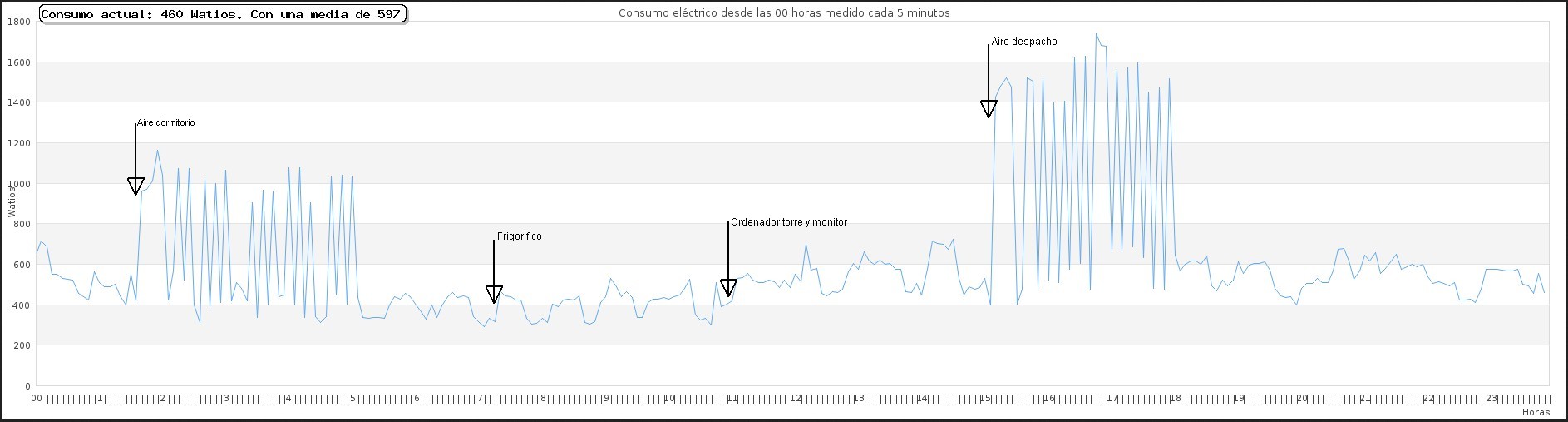 Por último, con consumo.php creamos la gráfica con los valores que tenemos en cada momento, un valor cada minuto y durante las 24 horas de cada día. La gráfica se genera con la libreria gratuita jpgraph y haciendo una llamada con nuestro navegador a este consumo.php donde este alojado.