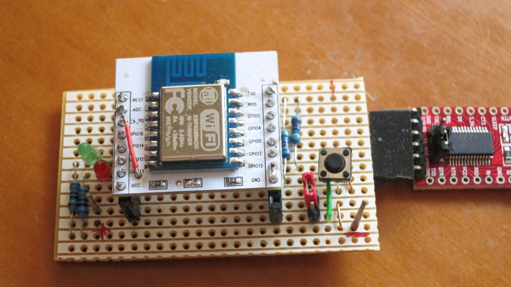 Se da por supuesto que se sabe cargar dicho firmware. Se ha utilizado el esp8266 modelo esp-12, ya que tiene todos los pines disponibles, incluso uno analógico. El módulo lo he montado sobre una placa de prueba que me permite simular una entrada con un pulsador, salidas LED para control y cargar firmware con un puente y un conector para el USB/Serie. El propio esp-12 esta soldado a otra placa que facilita esta conexión y el añadirle un integrado ams1117 para 3,3v lo que permite alimentarlo sin miedo con voltajes superiores. ¡¡Ojo!!, esta placa tiene un error y el ams1117 tiene que montarse "atravesado" y con un puentecito y NO como las pistas dan a entender. También hay que desoldar una resistencia marcada con 000 (cero ohmios) que hace de puente y es necesario eliminar.