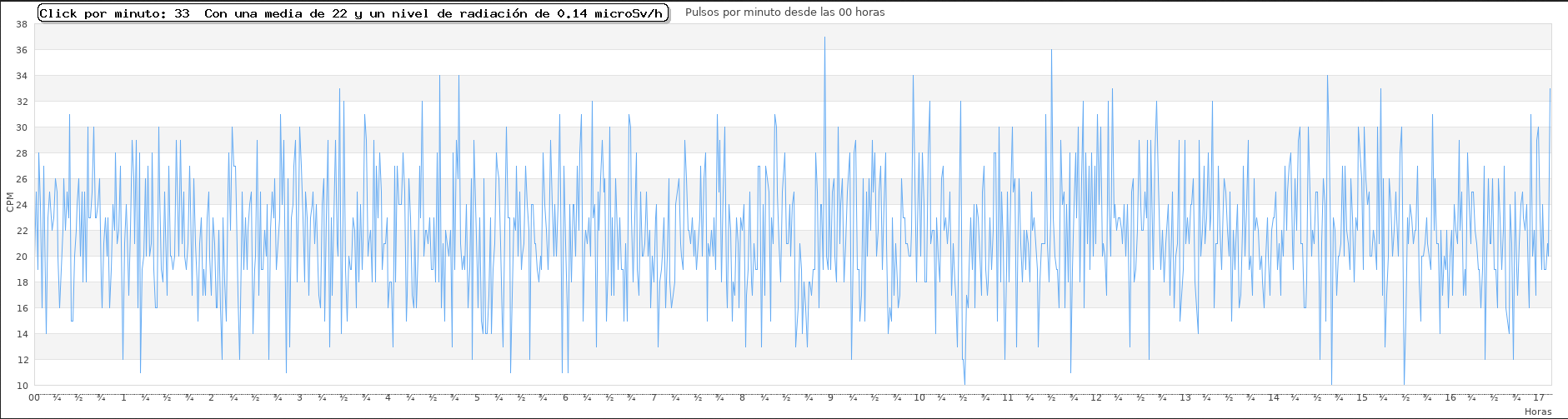 Es curioso que cada minuto, la radiación (los click) tienen bastantes variaciónes, pero al cabo de los días la media diaria es sorprendentemente estable.