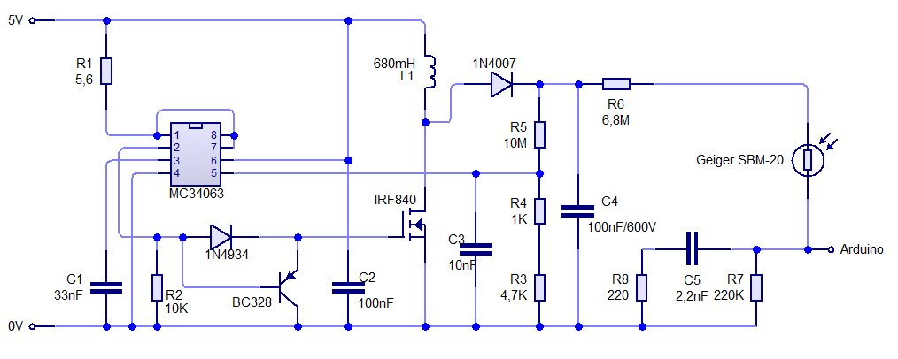 El circuito integrado MC34063 produce una oscilación que a través de MOSFET IRF840 pasa por la bobina L1 dandonos los 400v necesarios. El diodo 1N4934 debe ser de conmutación rapida o tipo Schottky. La bobina L1 la tenia hecha de otros montajes y es de 500 vueltas sobre nucleo de ferrita. Pueden ensayarse ya construidas de un valor como el señalado. El SBM-20 tiene señalado el positivo que debe orientarse hacia R6. En la salida marcada Arduino hay un pico de unos 4-5 voltios por cada particula que detecta el tubo.