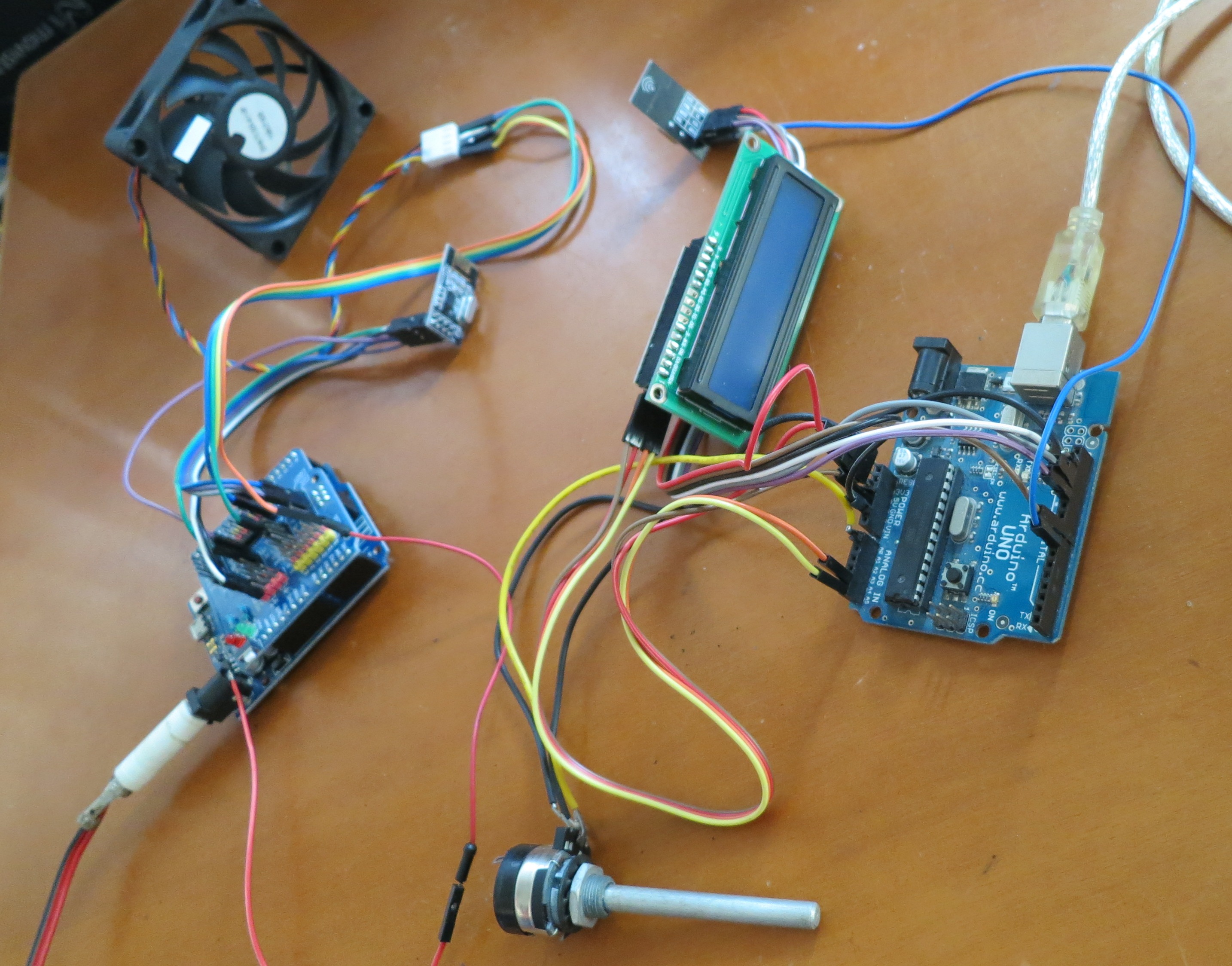 En este montaje se usan dos nRF24L con sus correspondientes Arduinos En uno de los Arduinos se añade un potenciometo en A0 y un display LCD (i2c) En el otro hay un ventilador de PC que nos da por el cable azul las RPM y por el amarillo permite un control PWM de su velocidad de giro. Para medir la RPM hay que unir el cable azul a positivo con una resistencia de 4k7. Supongo que por seguridad, el ventilador nunca se para del todo aún con PWM bajos. Al girar el potenciometro el nRF24L envia al segundo el valor PWM, que al ser recibido por el segundo nRF24L es suministrado al ventilador e inmediatamente retransmite al primero las nuevas RPM leidas. Estos dos valores, PWM y RPM pueden leerse en el display del primer Arduino. Las conexiones de los nRF24L pueden verse en el código del Arduino.