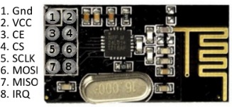 NRF24L01 Arduino pin VCC 3.3 V GND GND CS 8 CE 7 MOSI 11 MISO 12 SCK 13 */