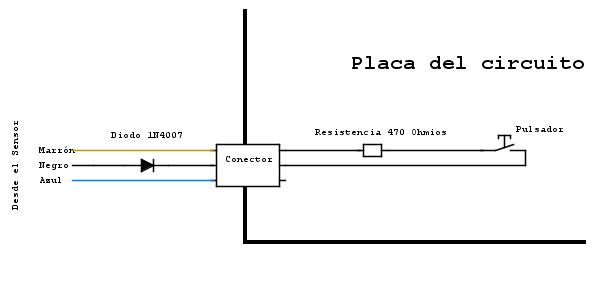 El circuito no tiene misterio, del sensor viene tres cables, el marrón de 12 voltios, el azul es masa y el negro se pone a 12 voltios cuando el SegWay esta estabilizado. Lo que hay que hacer es unir el de 12v y el negro a través de una resitencia de unos 470 ohmios y un pulsador. Se ha puesto un diodo en el cable negro para evitar que le mandemos corriente inversa al sensor al activar el pulsador.