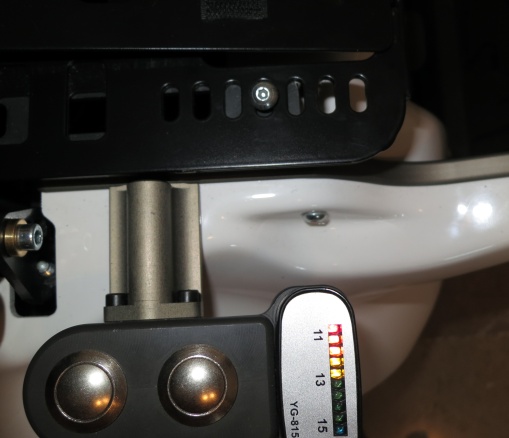 A la derecha, quitamos el panel frontal (otros cuatro tornillos Allen) y tambien hay que soltar las barras del sensor de presión al sentarnos. Son solo dos tornillos con rosca autoblocante. Recordar al montarlos luego que no hay que apretarlos del todo para que las barras puedan girar un poco. Ya se ve la tapa del mecanismo Genny. Solo son dos tornillos y la tapa sale facilmente.