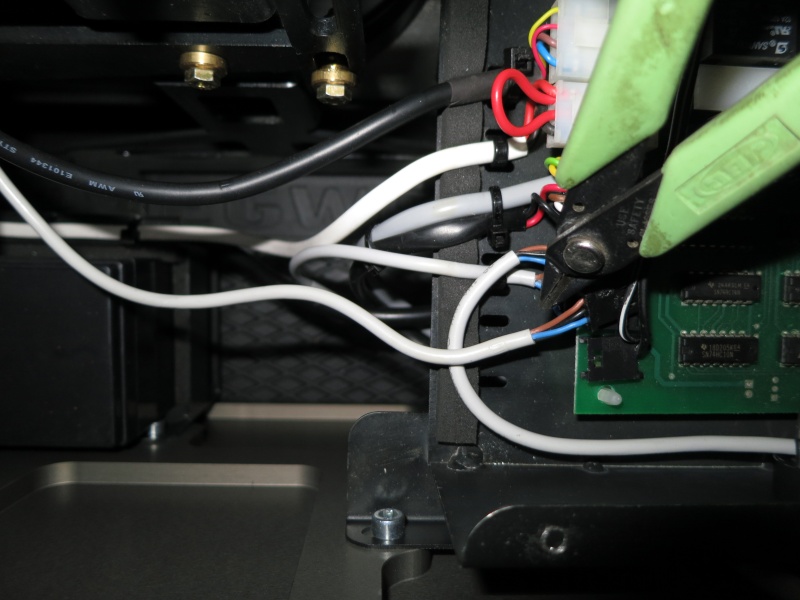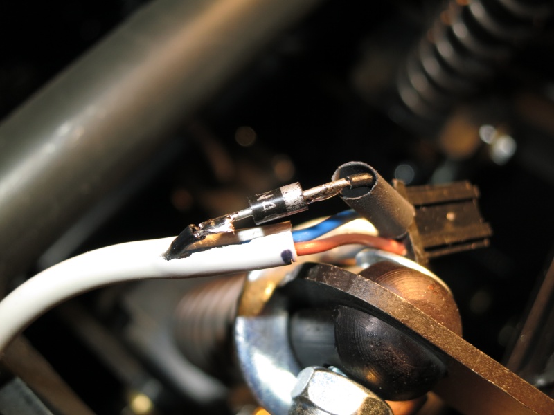 Sacamos el conector y con unos alicates de corte lo liberamos de bridas y pelamos con cuidado unos 4 centimetros el cable blanco envolvente. Se corta el cable negro y se intercala el diodo. La marca blanca hacia el lado del conector. Ponemos tubo termoretractil y cinta aislante.