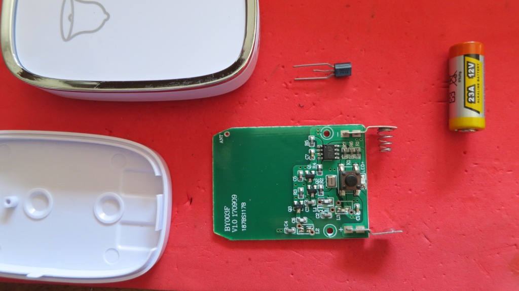 Lo primero es abrir la cajita del pulsador y extraer la placa. Desechamos la pila de 12v ya que alimentaremos con una fuente externa de ese voltaje. La acción de pulsar la haremos electrónicamente uniendo las dos patillas superiores del pulsador con un transistor NPN 2N2222 y que activaremos con el pin P1.