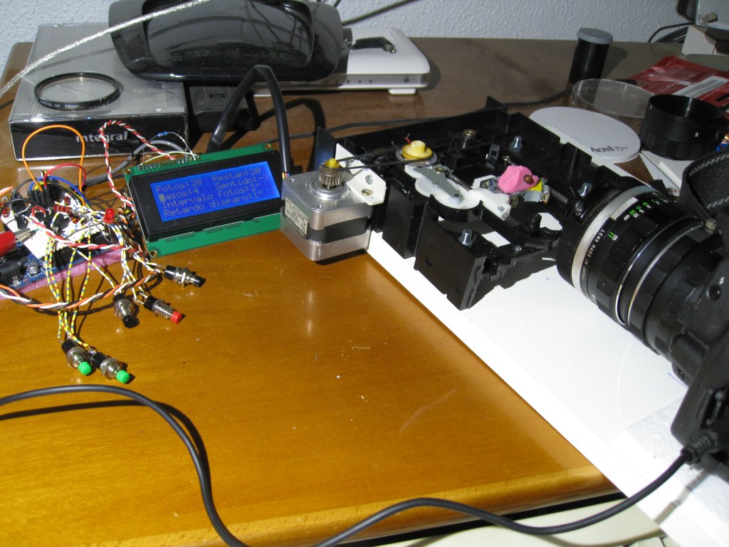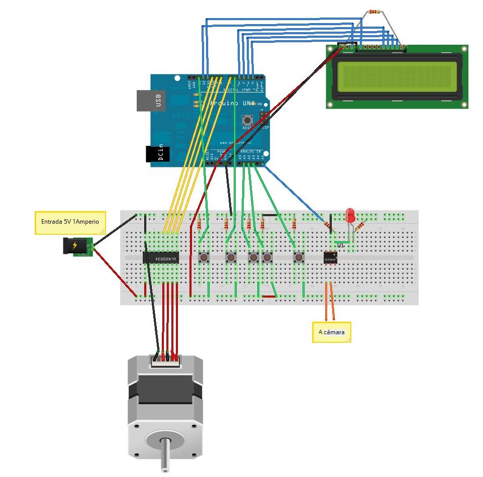 Finalizado el prototipo con un Arduino Uno, he usado un Arduino Nano soldando el ULN2003 y el display directamente a los pines del Nano. El Arduino controla el disparador de la cámara a través de un optoacoplador que la aísla eléctricamente del resto.