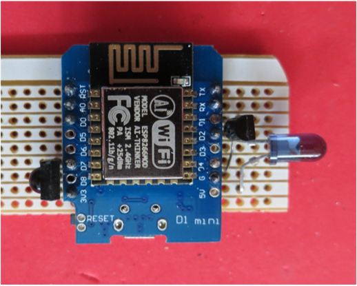 El montaje es minimalista, una placa WeMos mini, diodo IR, transistor 2N2222 y receptor de IR para leer los códigos de nuestro mando a distancia. Esto incluso lo podremos ahorrar si el TV es Samsung ya que están en el Sketch de Arduino que pongo más abajo.